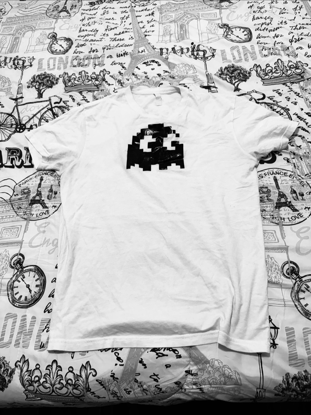19White t-shirt. Features a black Pac-Man ghost on the front. It is a simple yet effective way to look stylish.