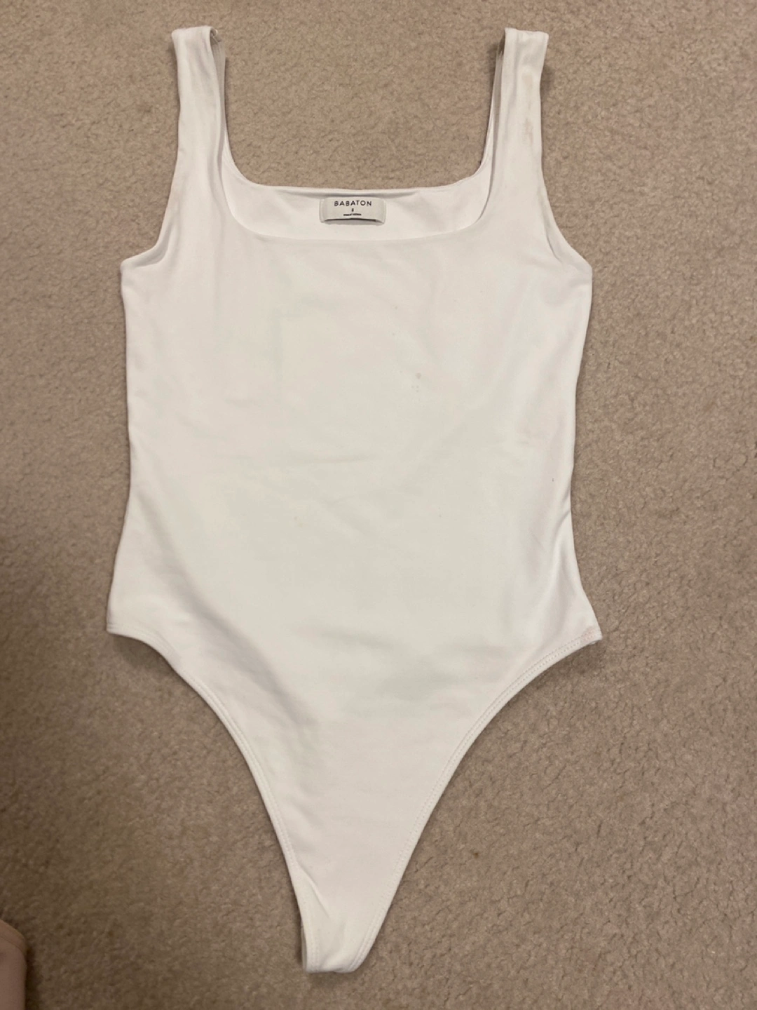 White bodysuit. Sleeveless with a square neckline. Designed with a thong bottom. Can be layered under other garments for warmth.