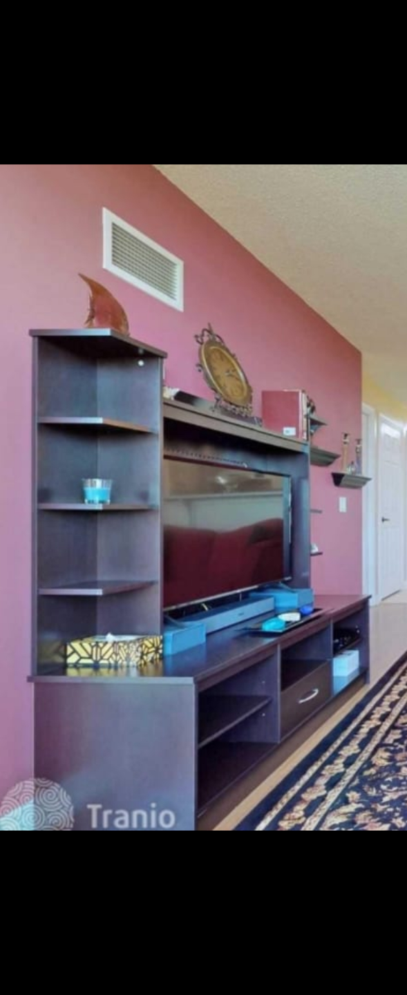 Entertainment unit, in a dark brown colour. Built in shelves, and storage. A great place to wind down after a long day, watching your favourite show.