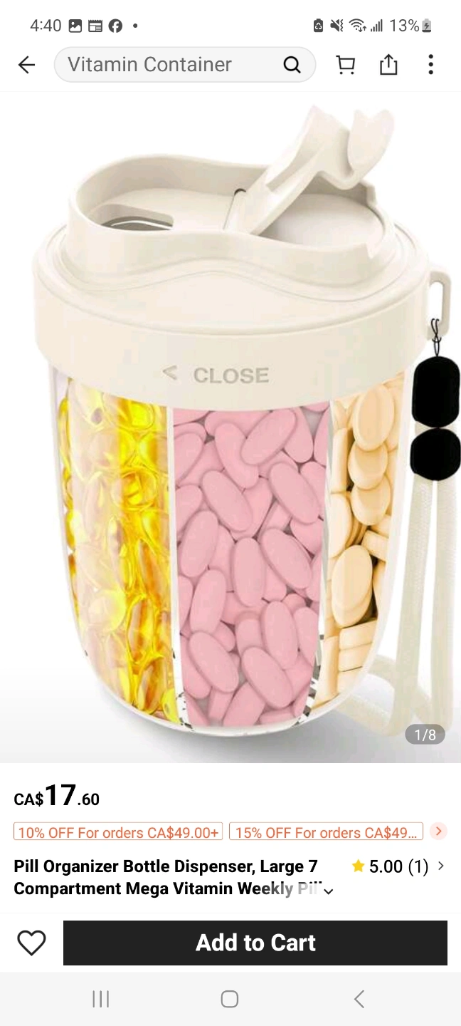 A clear container. Compartments for pills. Great for planning your weekly medication.Theres 7 compartments to hold sll your vitamins.