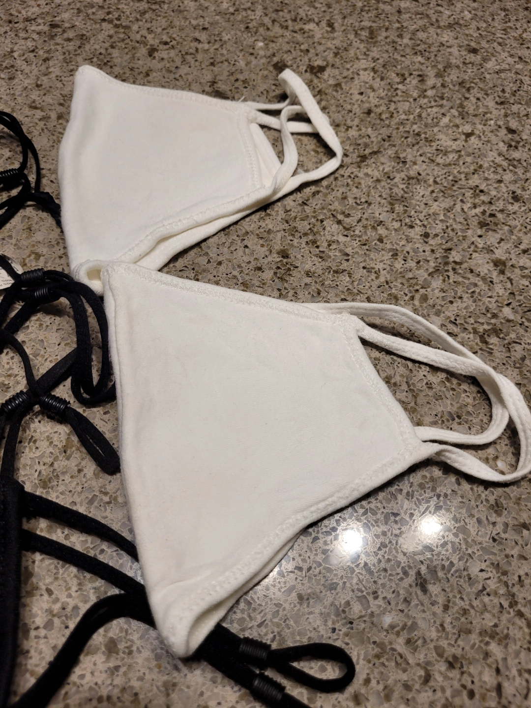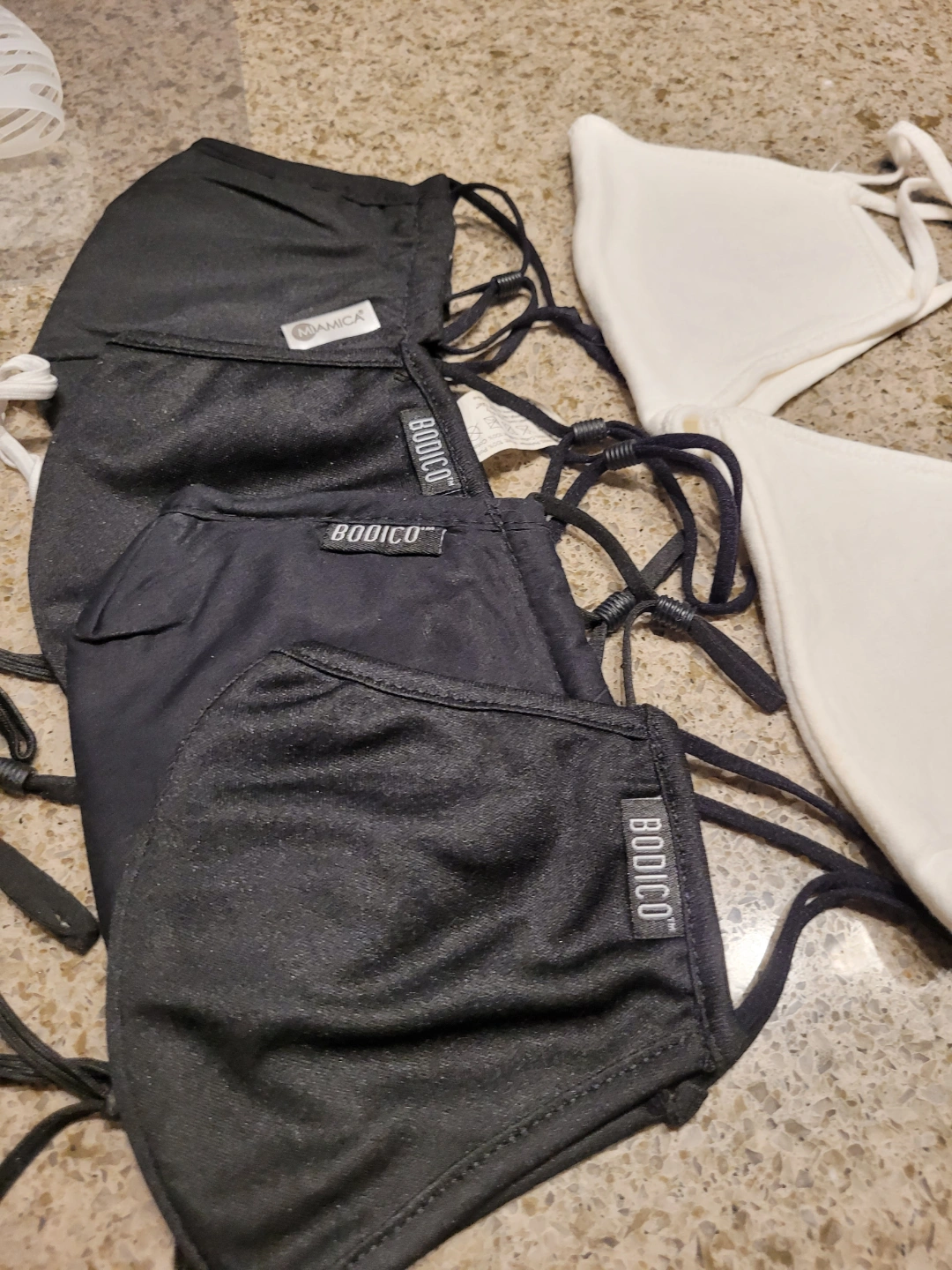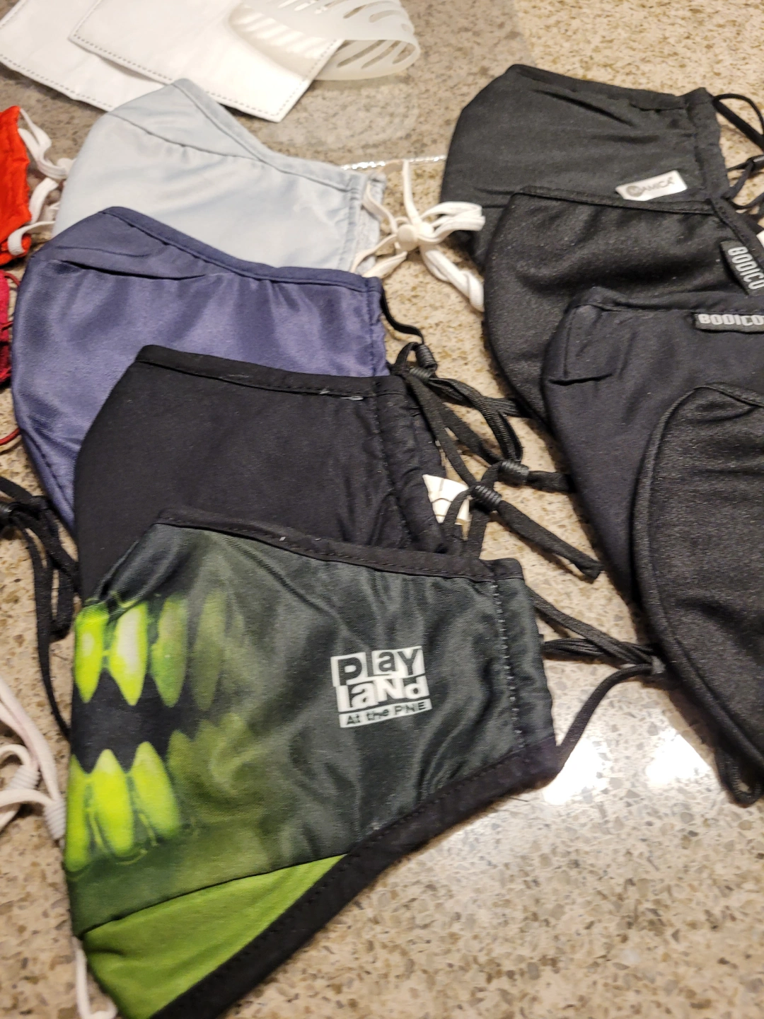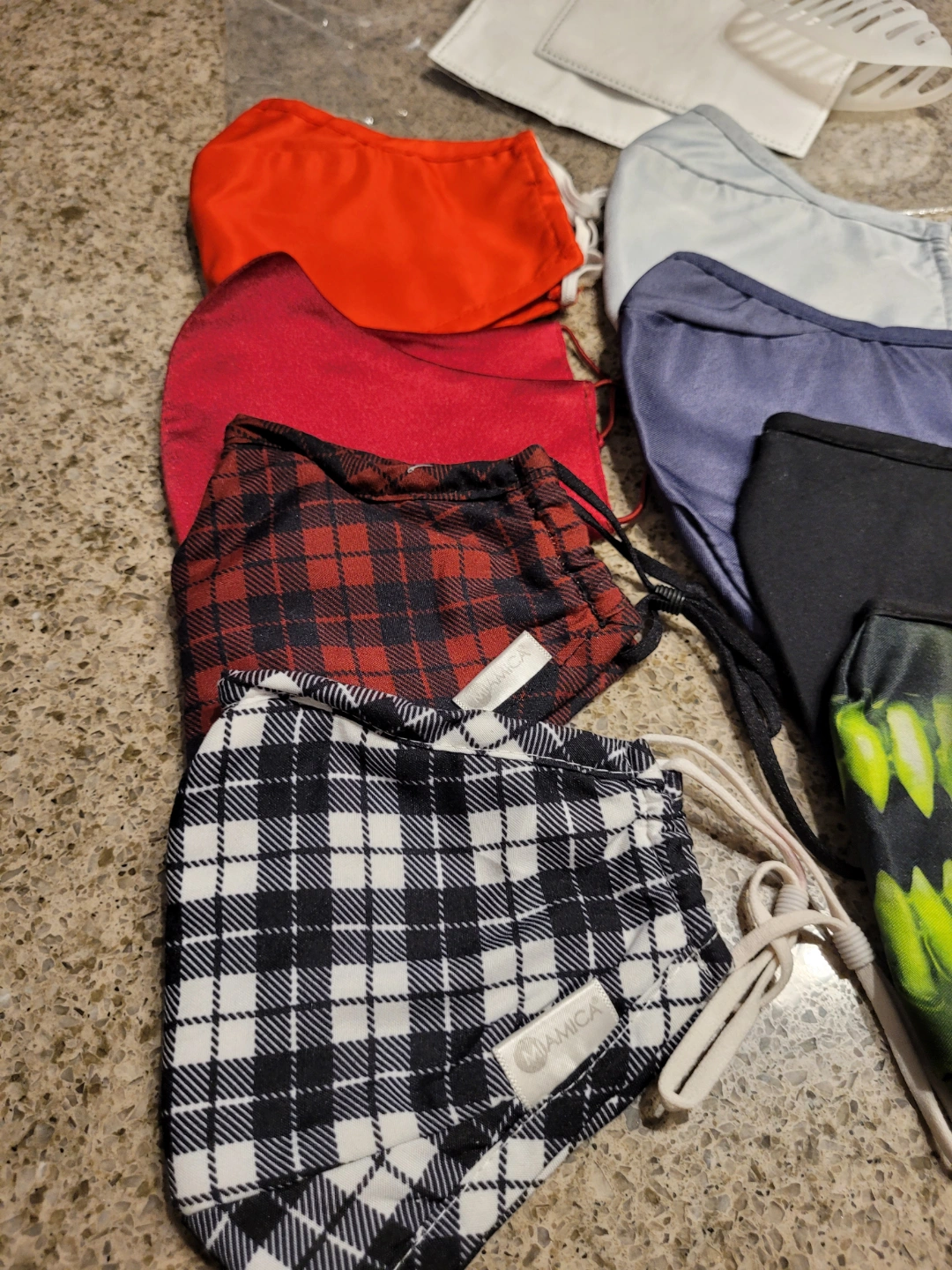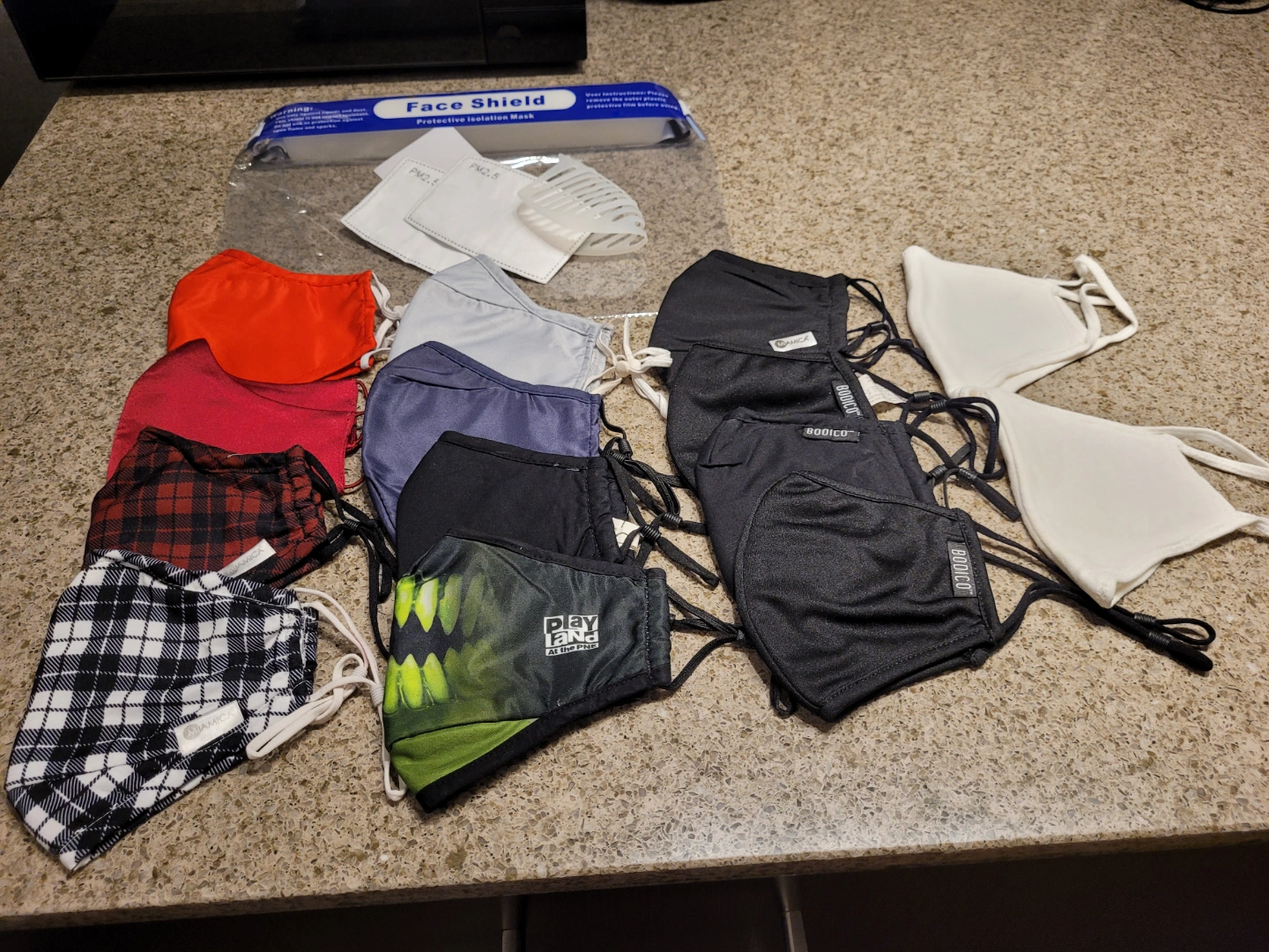 Lot of assorted face masks. Many different colours and patterns. Elastic ear loops. A face shield and filters are also included