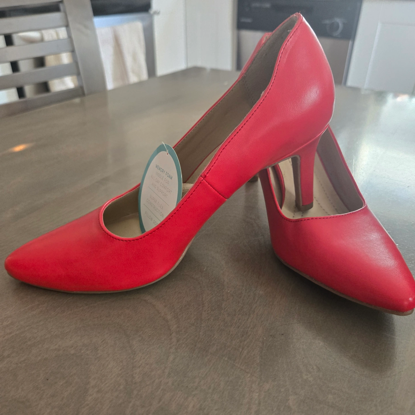 Pair of red heels. Pointed toe style. Comes with tags still attached. Can be a nice addition to your wardrobe, offering a sense of confidence and pure comfort with the memory foam beds.