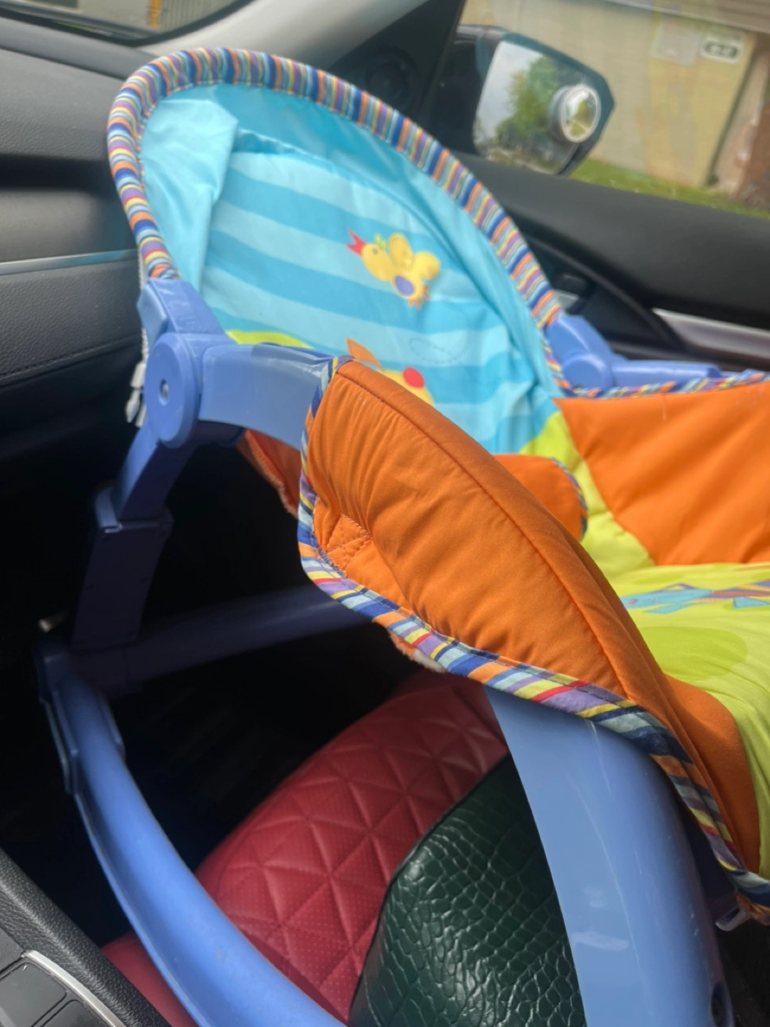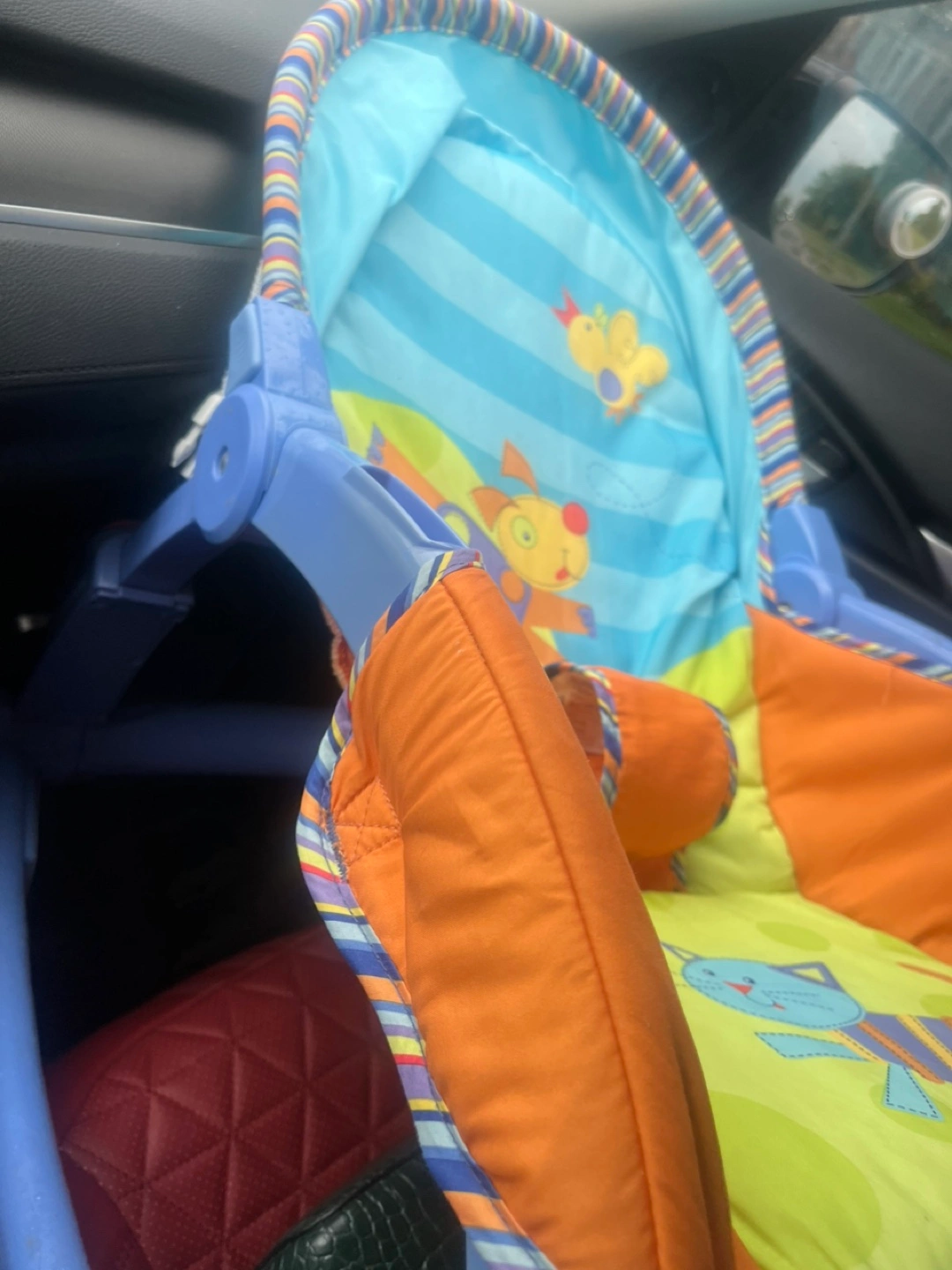 Colourful baby bouncer. Features cartoon characters on the seat. The seat is surrounded by an orange cushion. This is perfect for providing a soothing and secure space for your little one to rest peacefully.