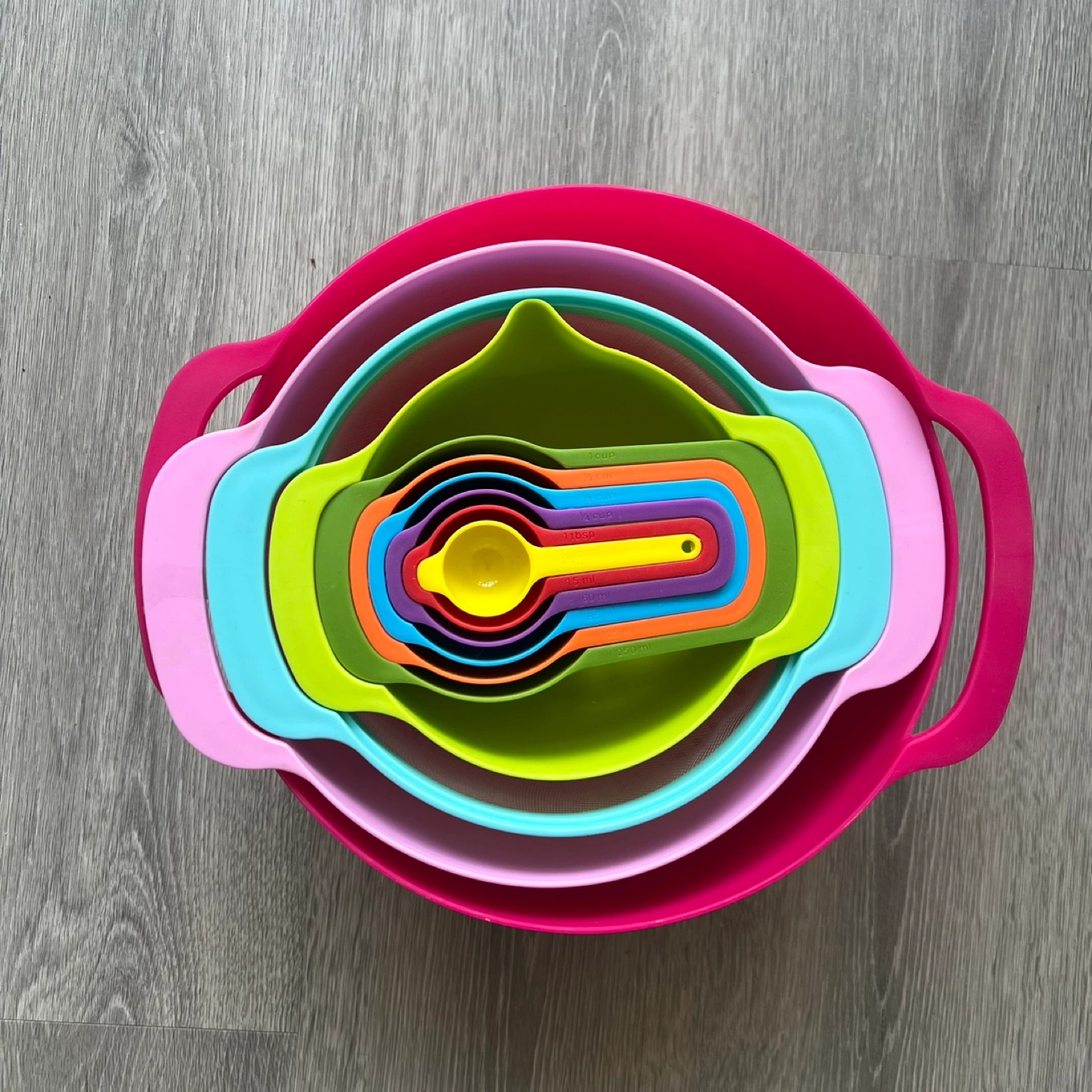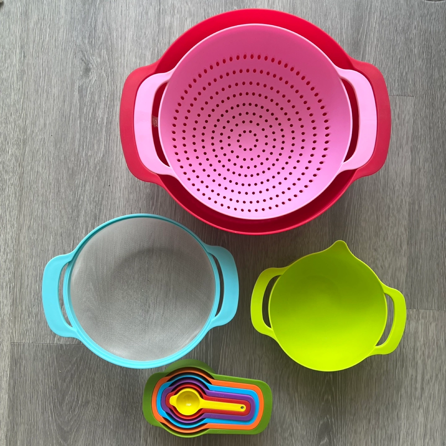 Includes various kitchen tools, like bowls , strainers, and measuring spoons. There are handles on some of the items making them stack nicely together. This set can bring ease and fun to your cooking experience.