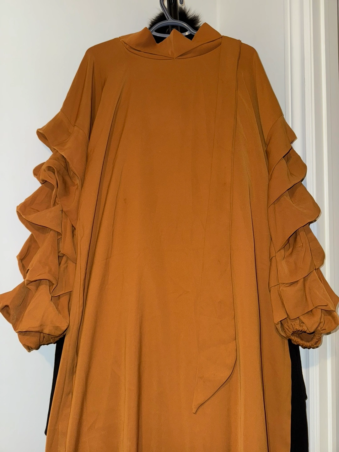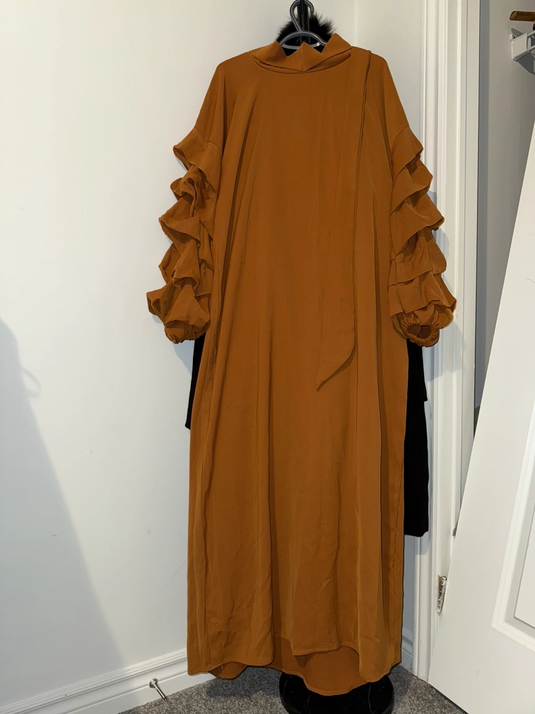 261A maxi dress in a brown colour. Perfect for Eid Featuring long sleeves with ruffles. Can be a nice addition to a wardrobe, adding a touch of elegance to your outfit. Size 10-14