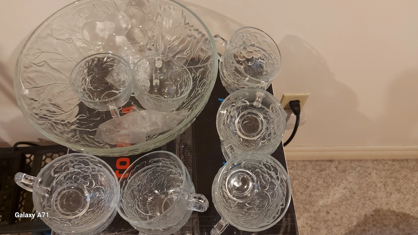A clear glass punch bowl. Includes several handled cups, and a smaller bowl. Great for entertaining family and friends. 12 glasses with Bowl set .