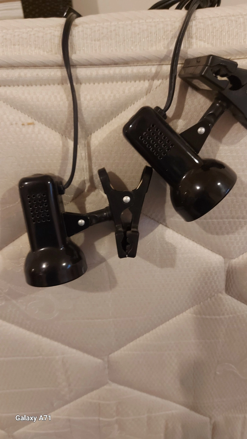 Two black clip-on lamps. They appear to have a sleek design and are attached to clips with a flexible neck. Consider using them for a cosy reading experience.EACH ONE IS $2.50