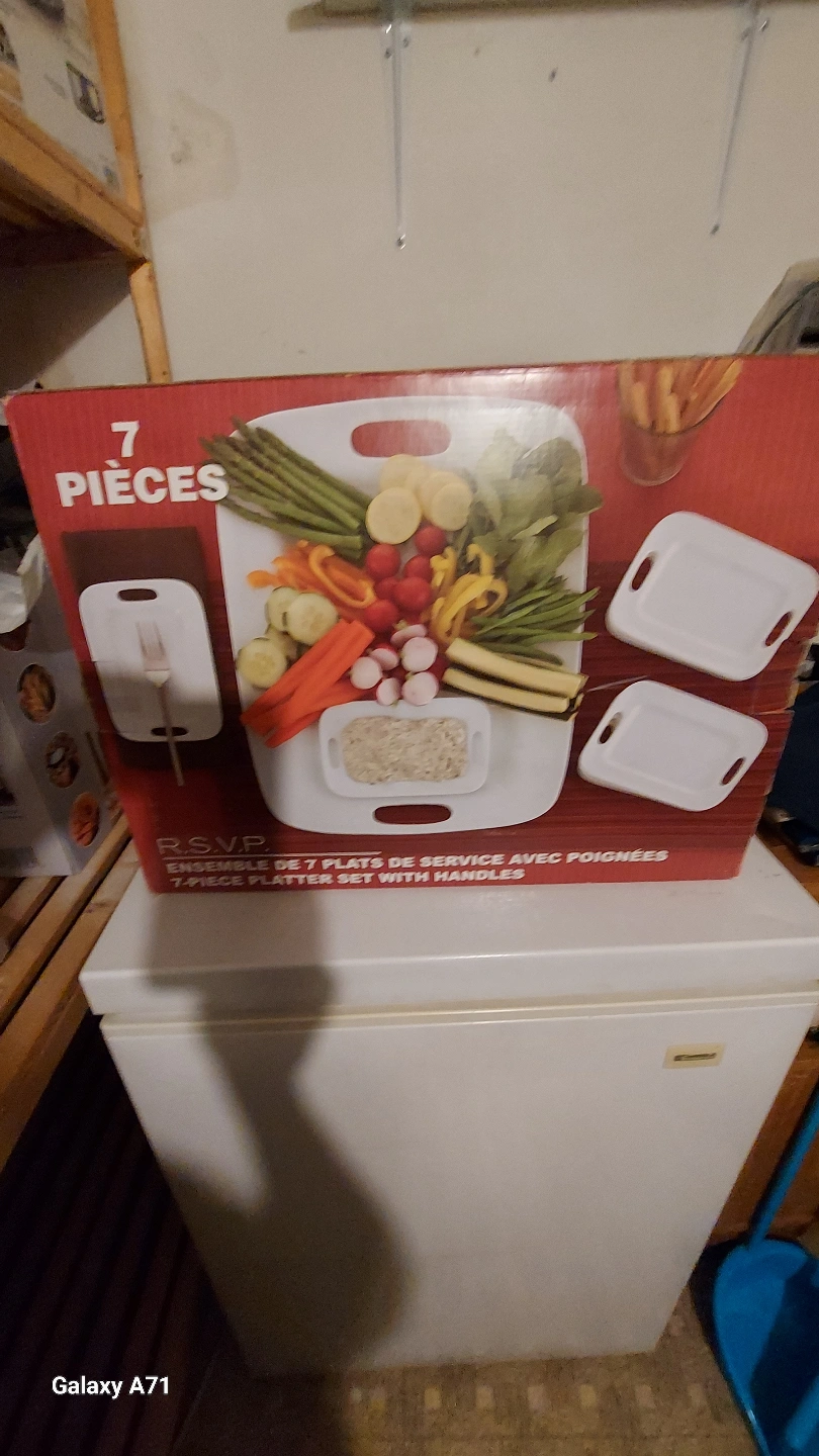 A 7-piece platter set. Included is a large platter with handle, three smaller trays, and a dish with a handle. The set comes with a cutting board, perfect for preparing and arranging a snack. This set is a great way to present food for gatherings.