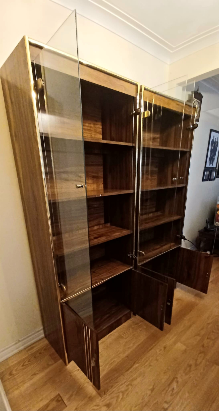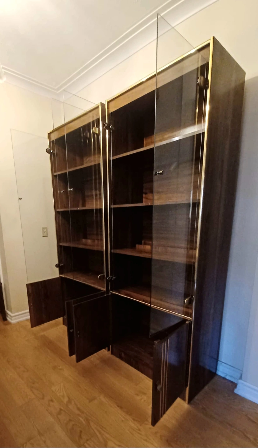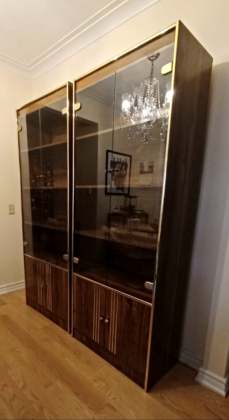 Matching display cabinets. Shelves with glass doors, gold trim around the edges. Perfect for organizing and showing off your prized possessions.