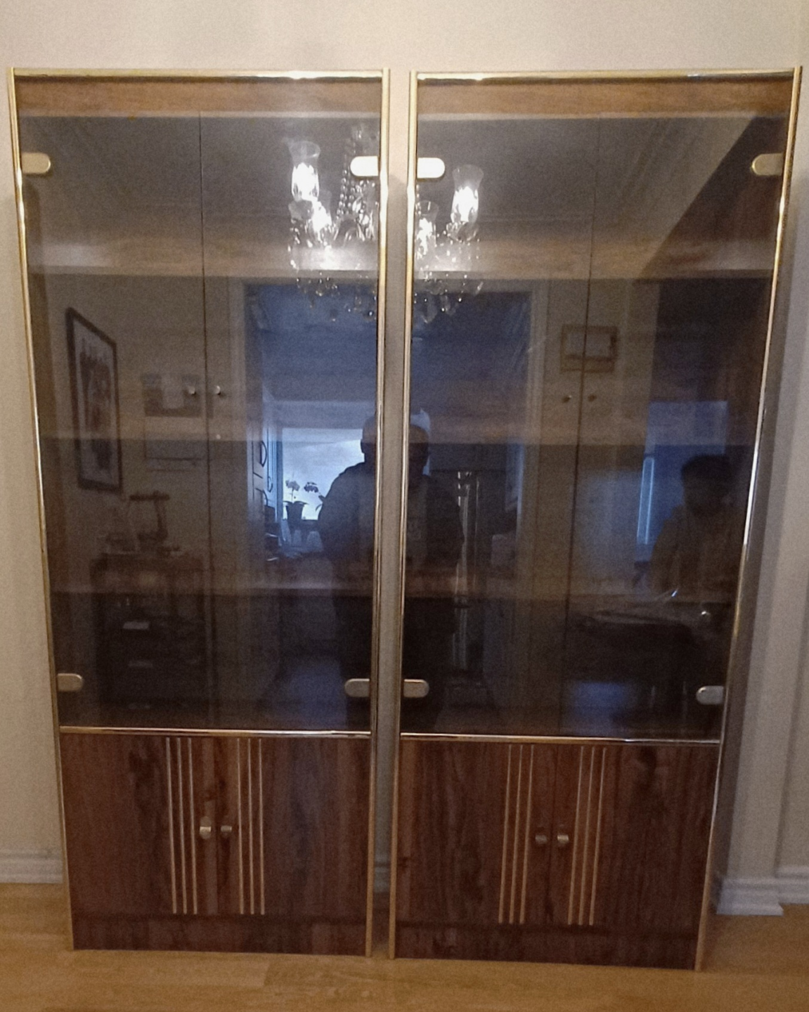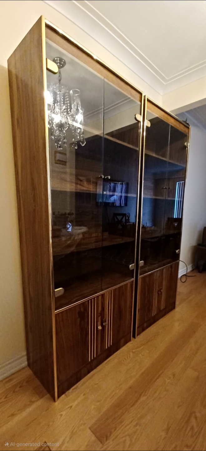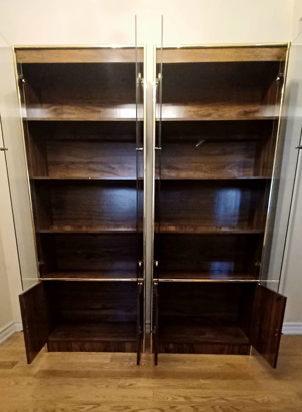 Matching display cabinets. Shelves with glass doors, gold trim around the edges. Perfect for organizing and showing off your prized possessions.