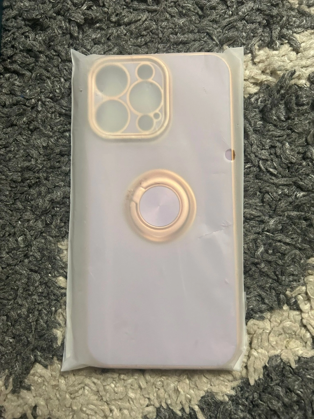 Phone case in package. Lavender colour. Features a gold ring holder. This phone case can bring you peace of mind knowing your phone is safe.