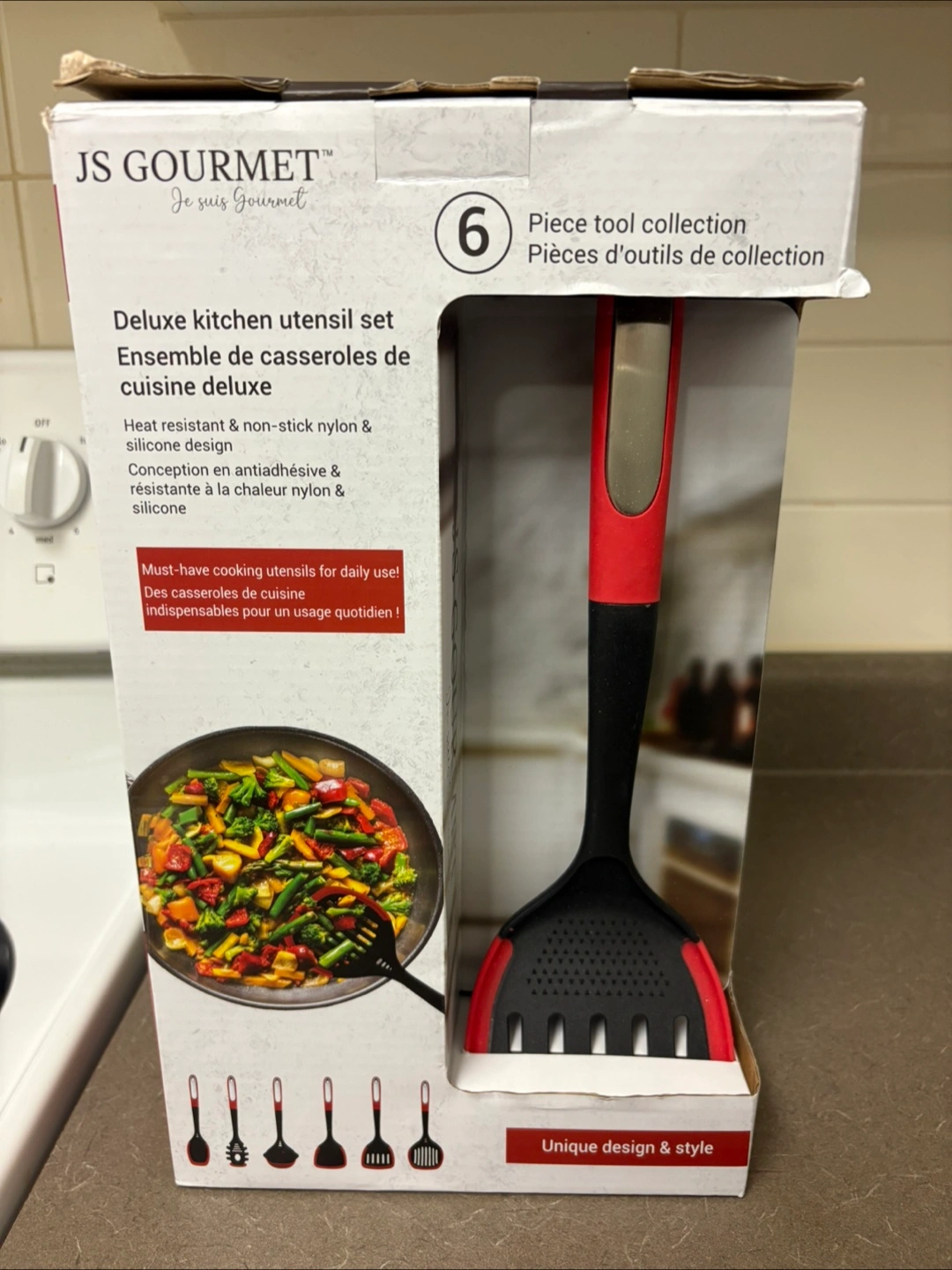 Four-piece kitchen utensil set. Features heat-resistant and non-stick nylon and silicone design. Comes in a box. This set is perfect for anyone who enjoys cooking a hearty meal in their own home.