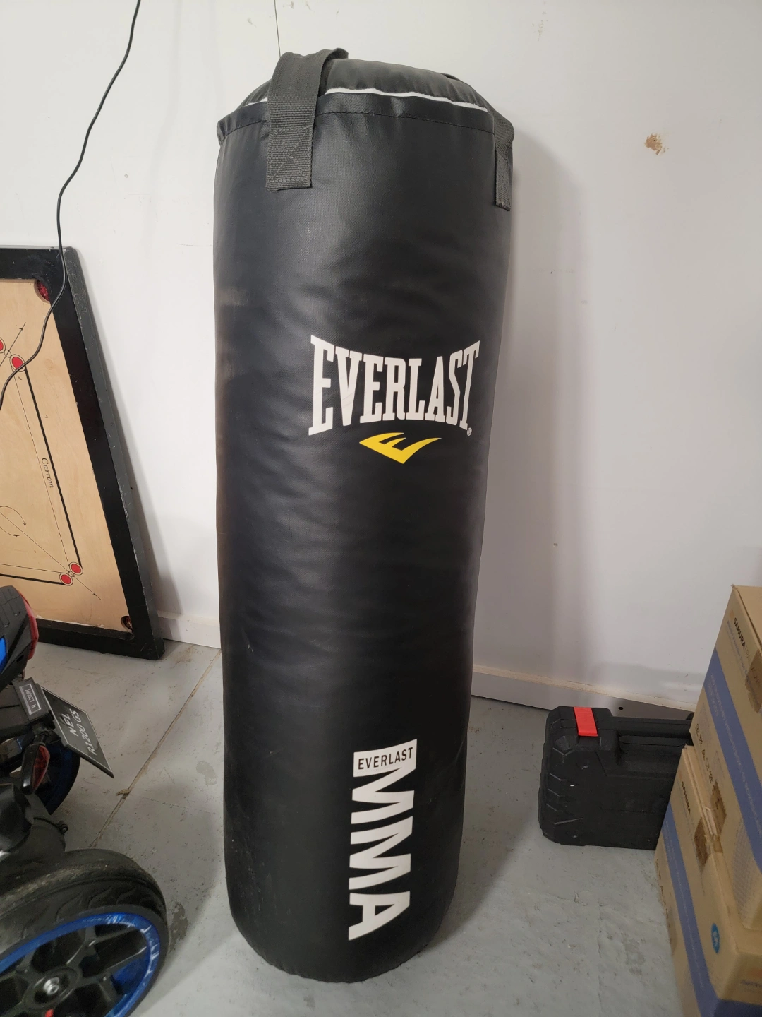 78Black, cylindrical punching bag. Has handles at the top. Features the Everlast logo in the front and MMA printed on the side. Consider this bag when looking for an excellent way to release some stress.