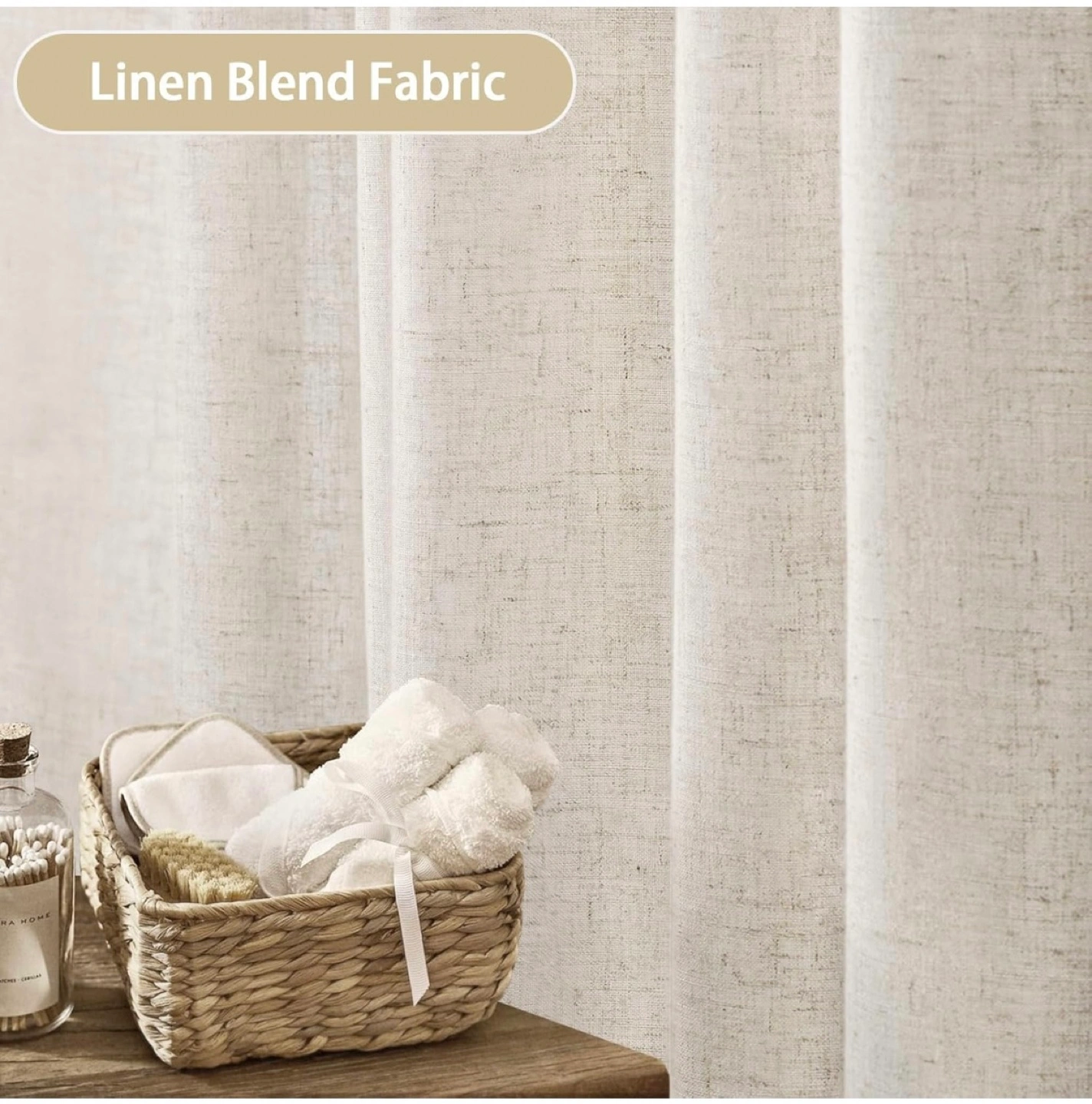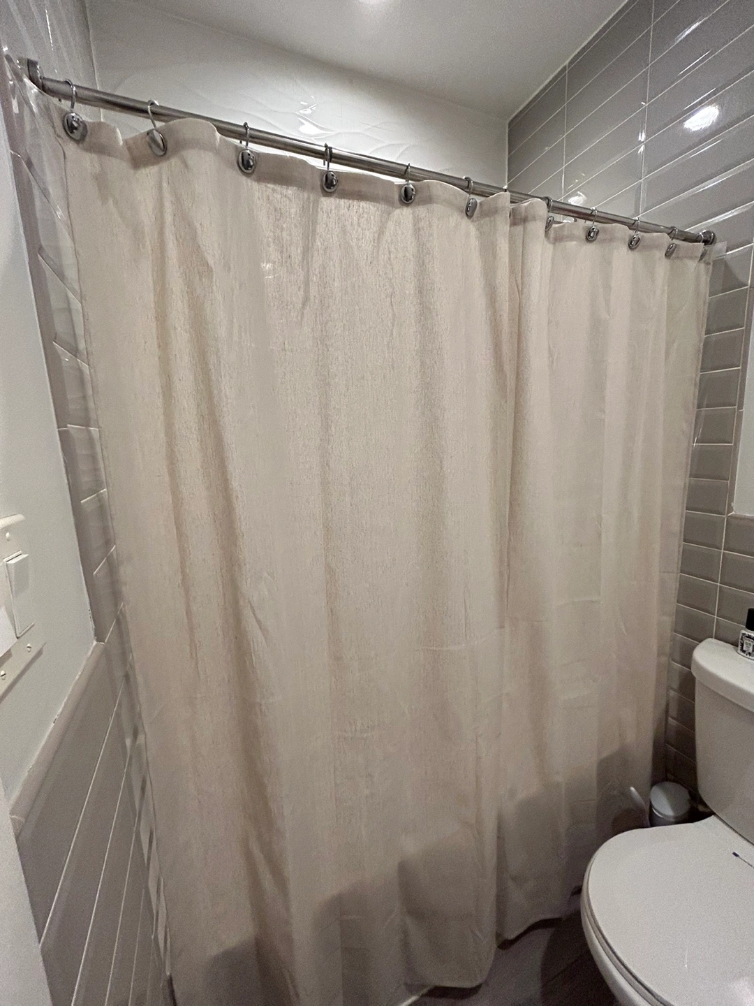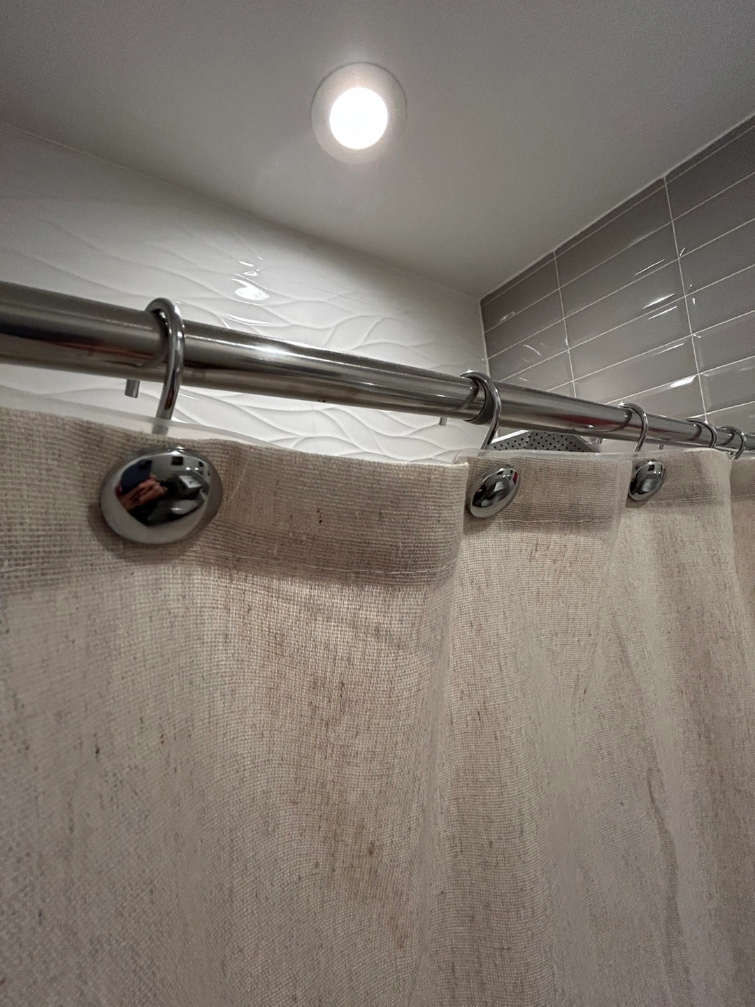 Shower curtain in linen fabric, neutral beige cream color and silver chrome metal shower curtain hooks.
