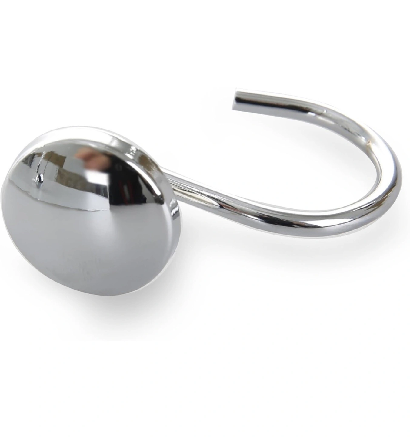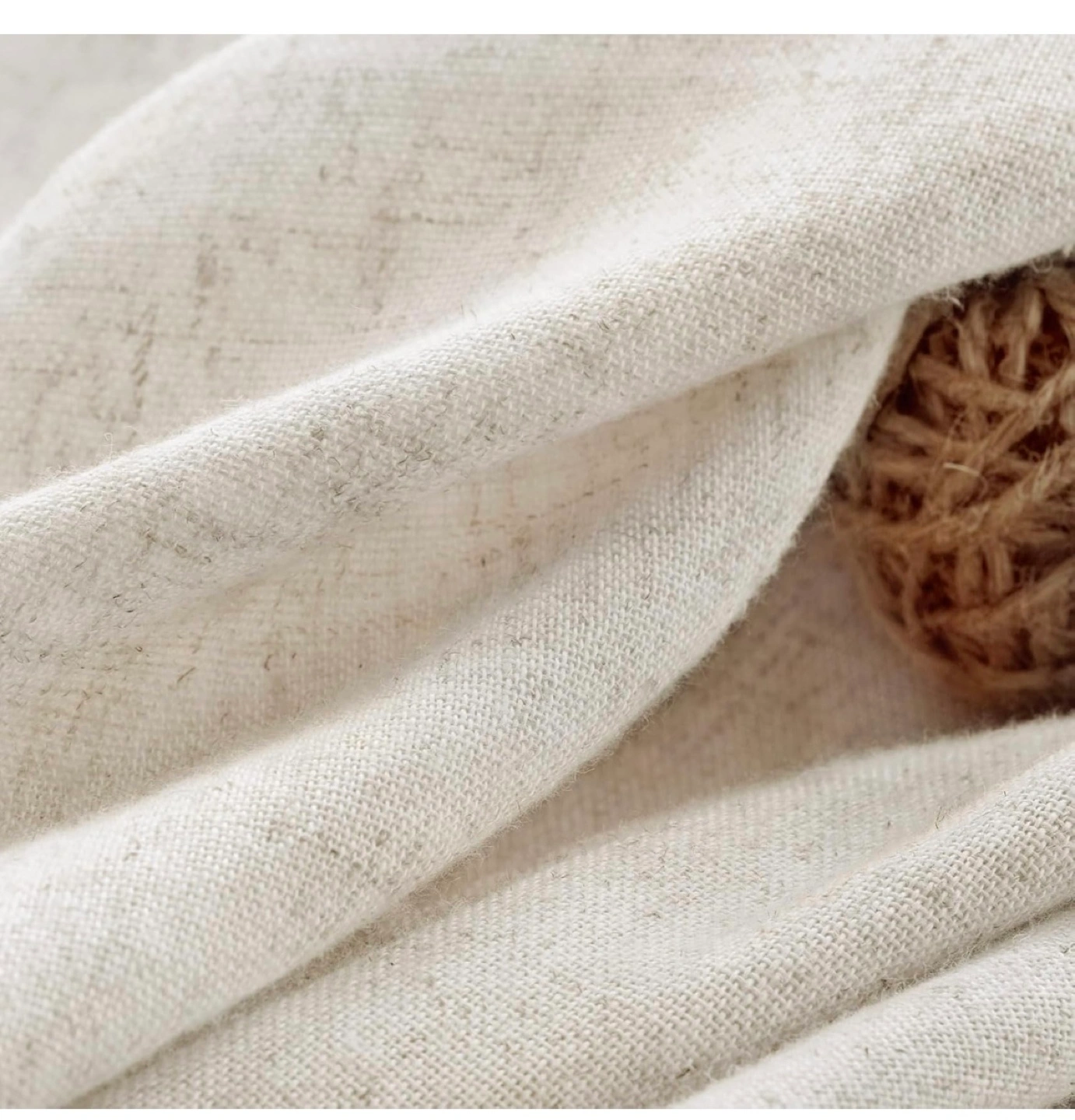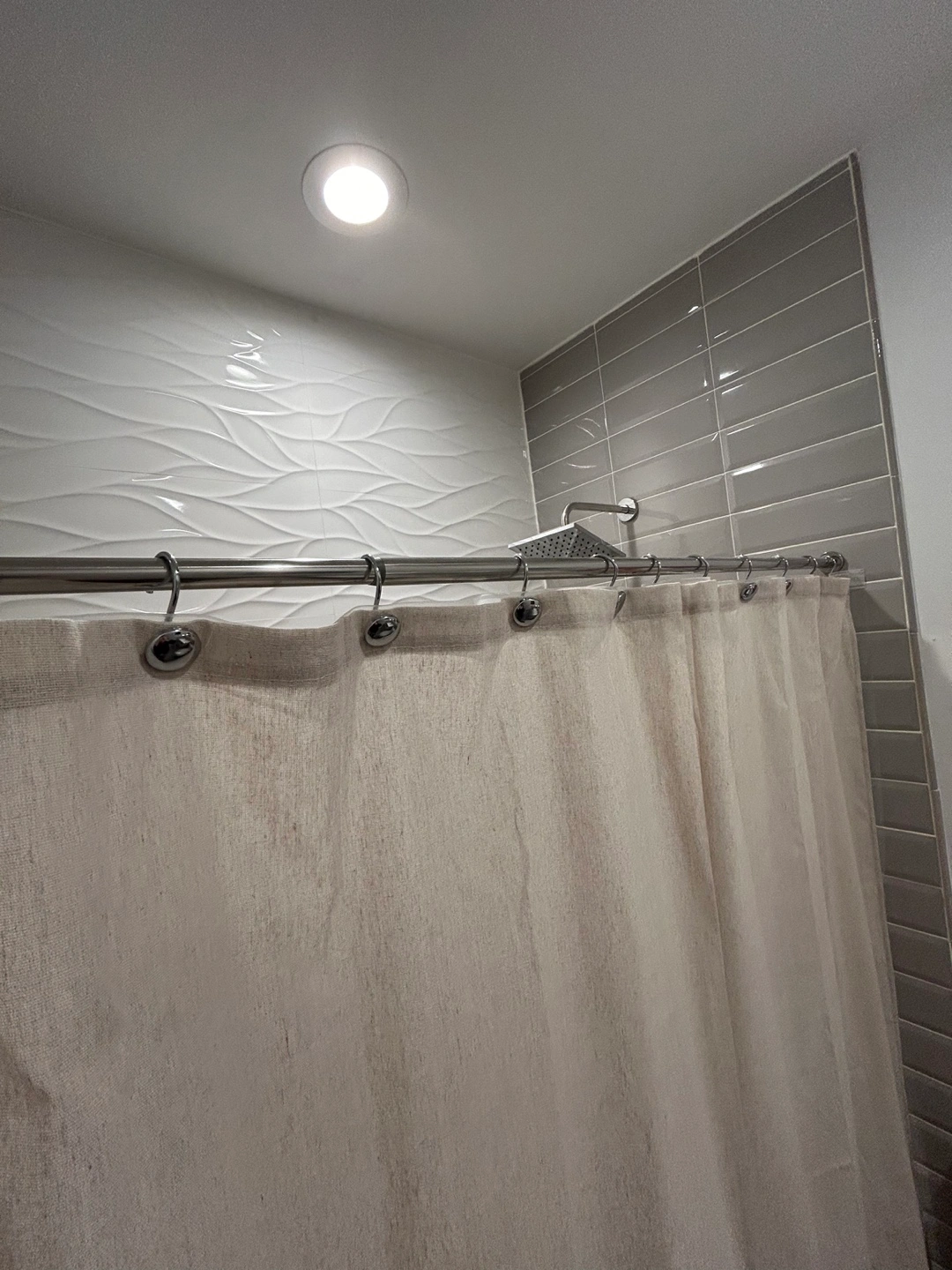 Shower curtain in linen fabric, neutral beige cream color and silver chrome metal shower curtain hooks.