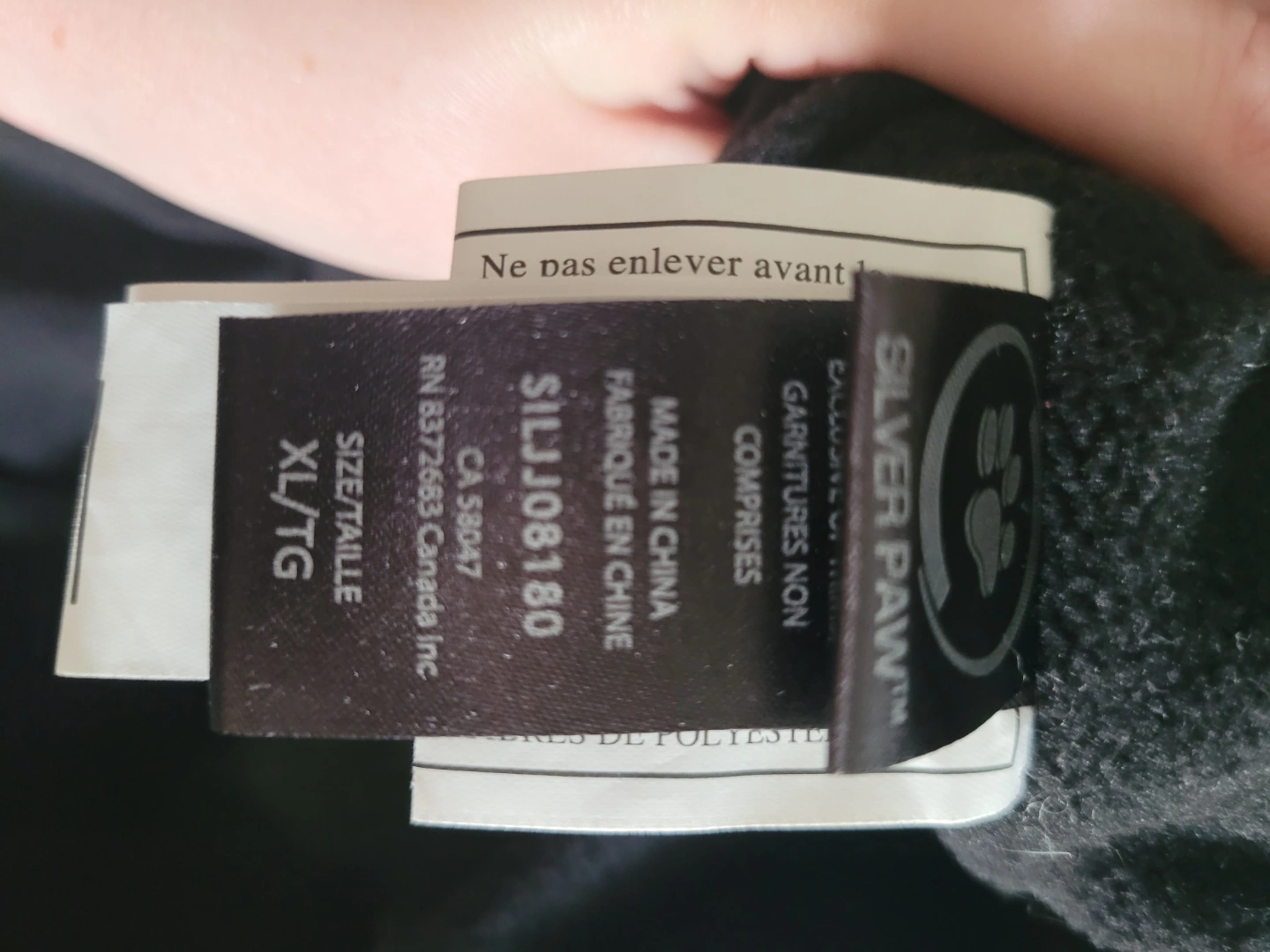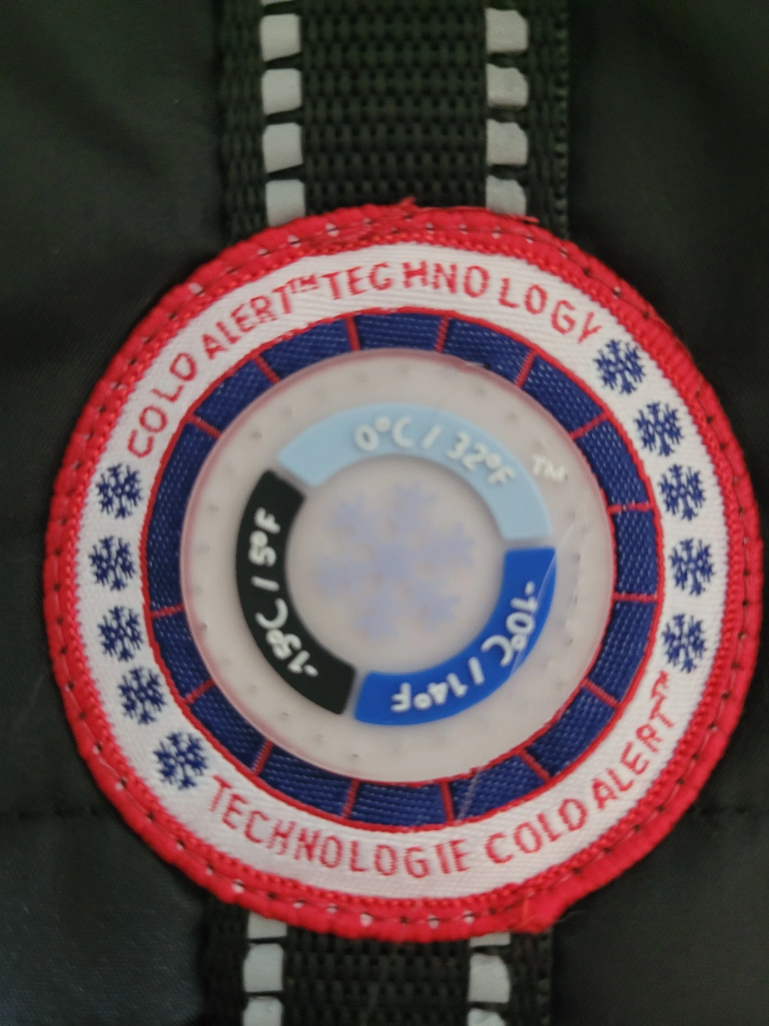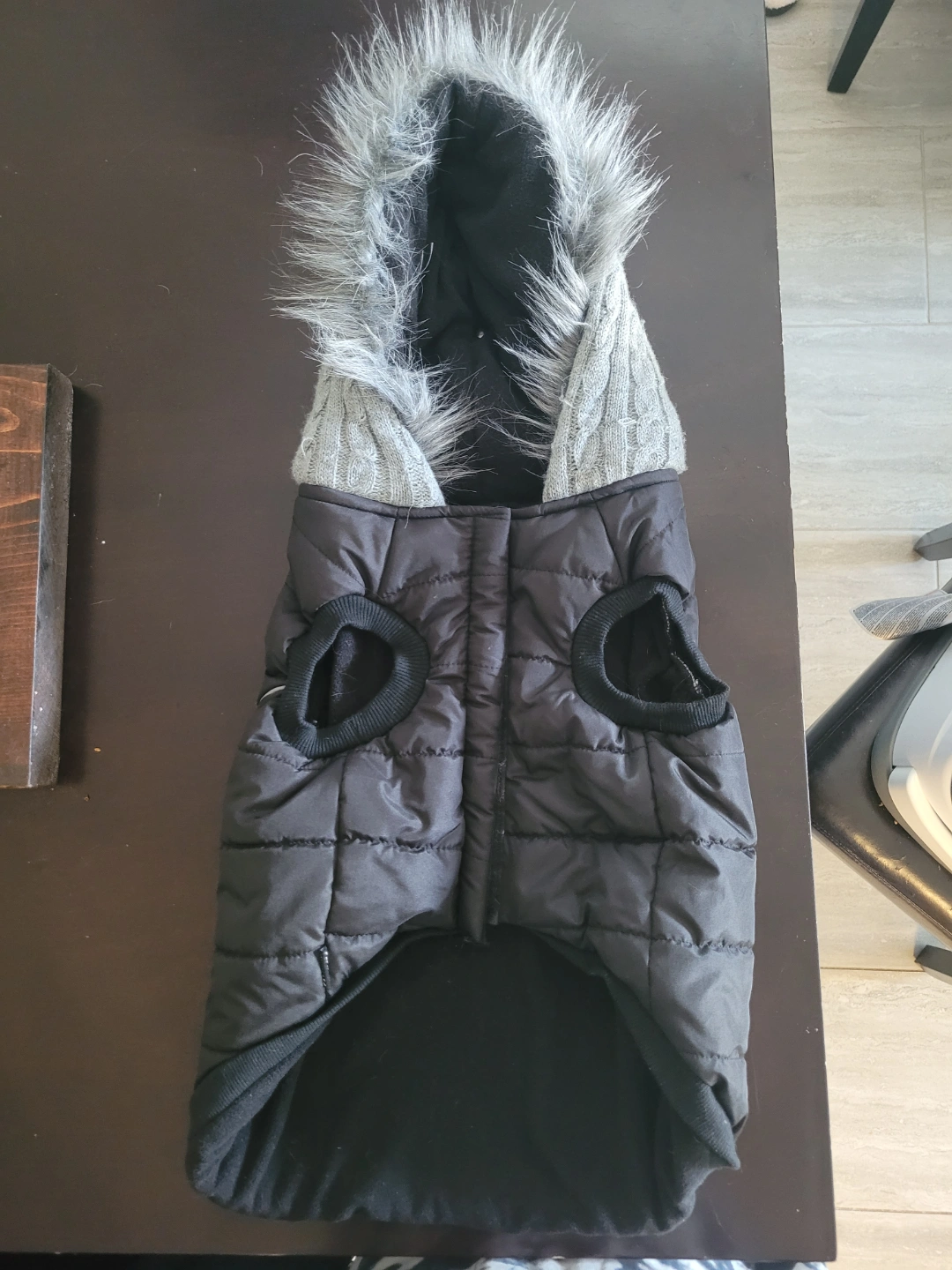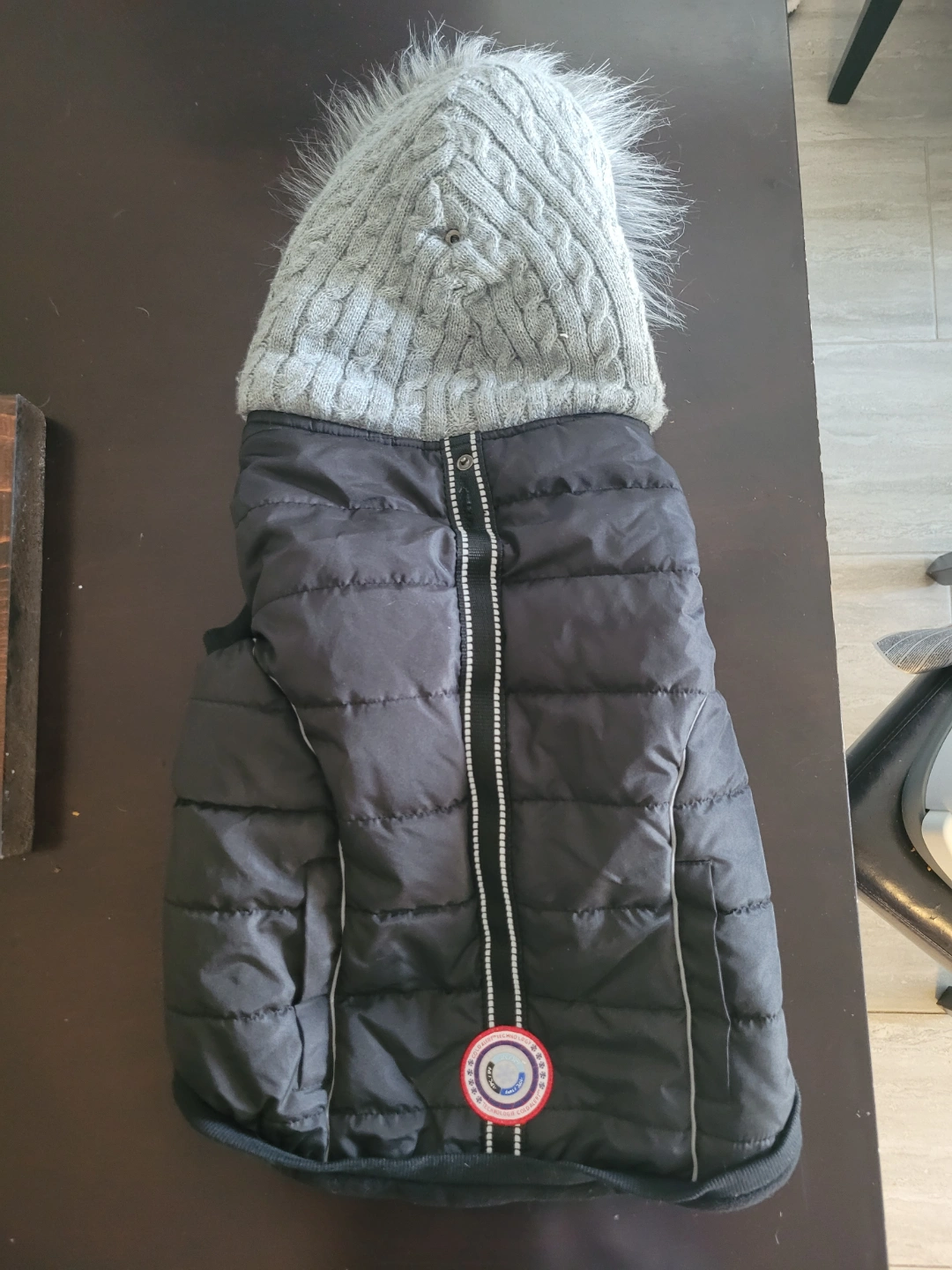 Black coat with a grey knit hood. Padded design with a zipper closure. Includes a Cold Alert technology emblem. Perfect for a calm walk in the snow. Used once, great condition!