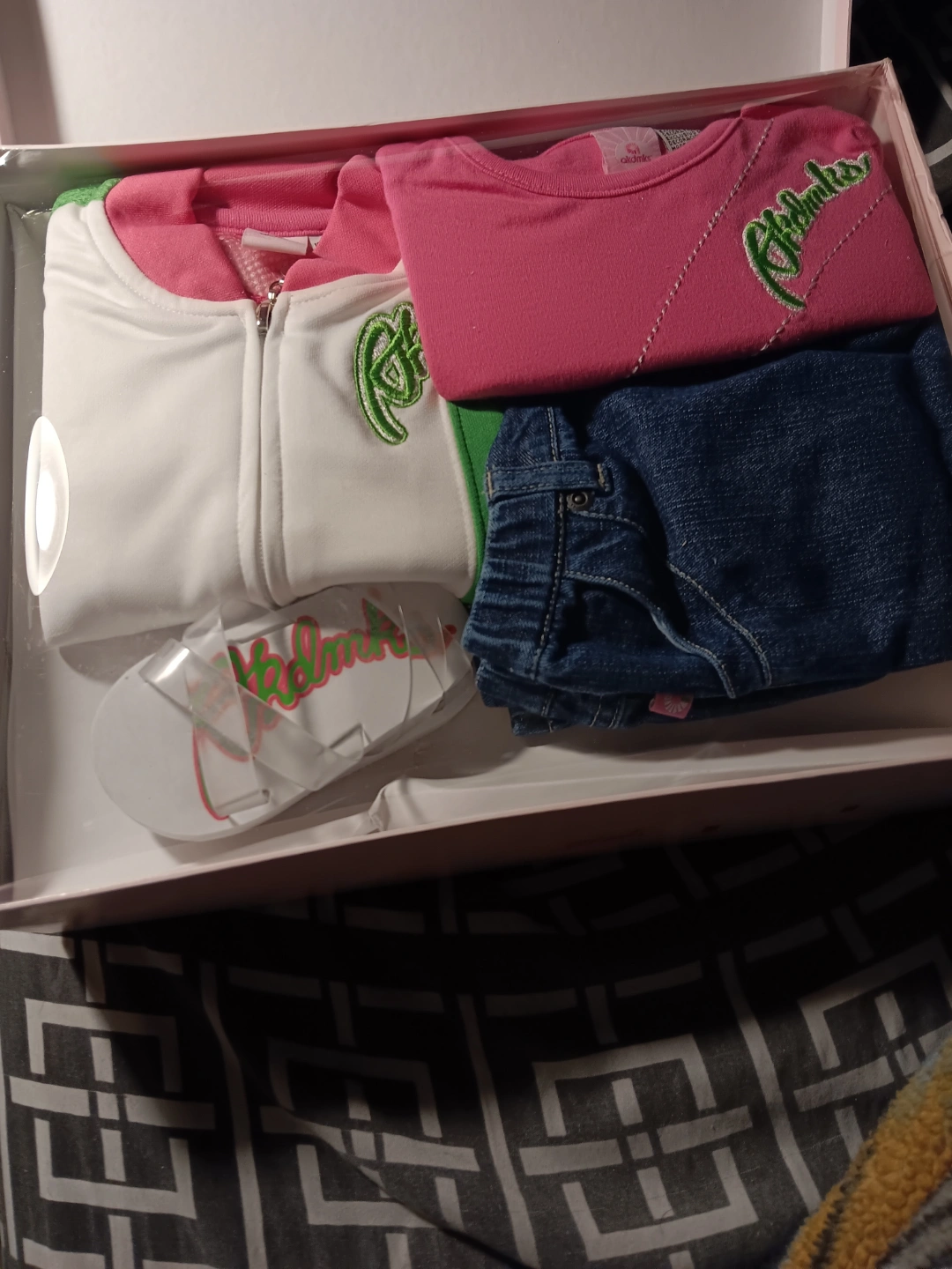 Pink box containing clothes and shoes. There's a jacket, top, jeans, and sandals. The items are white, pink, green, and blue. The box is a nice way to store some items together.