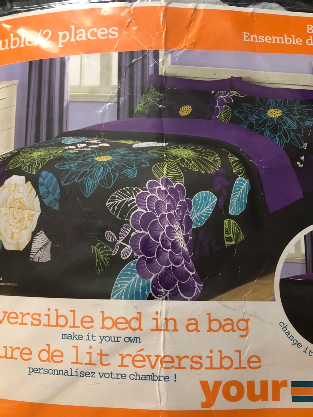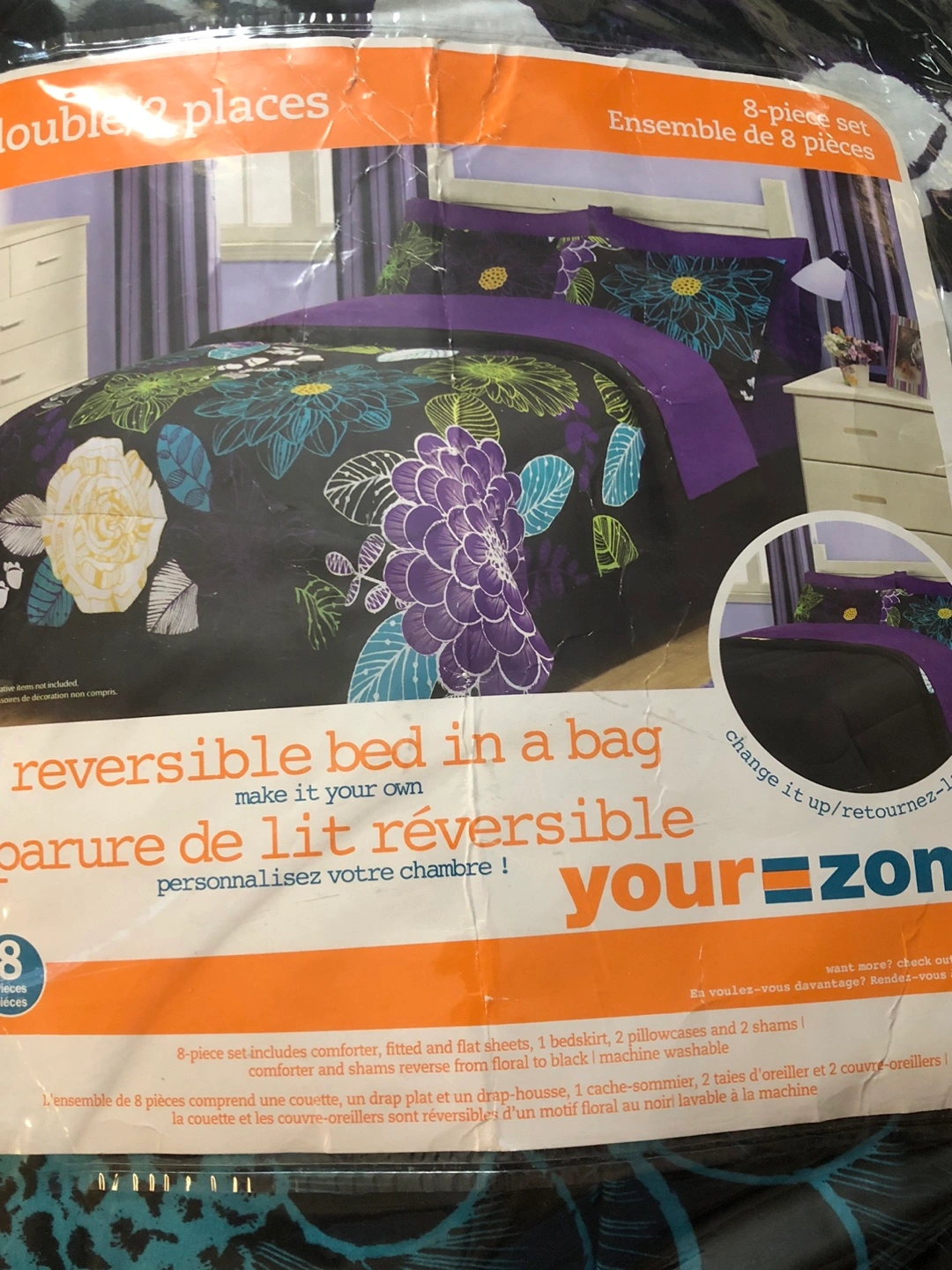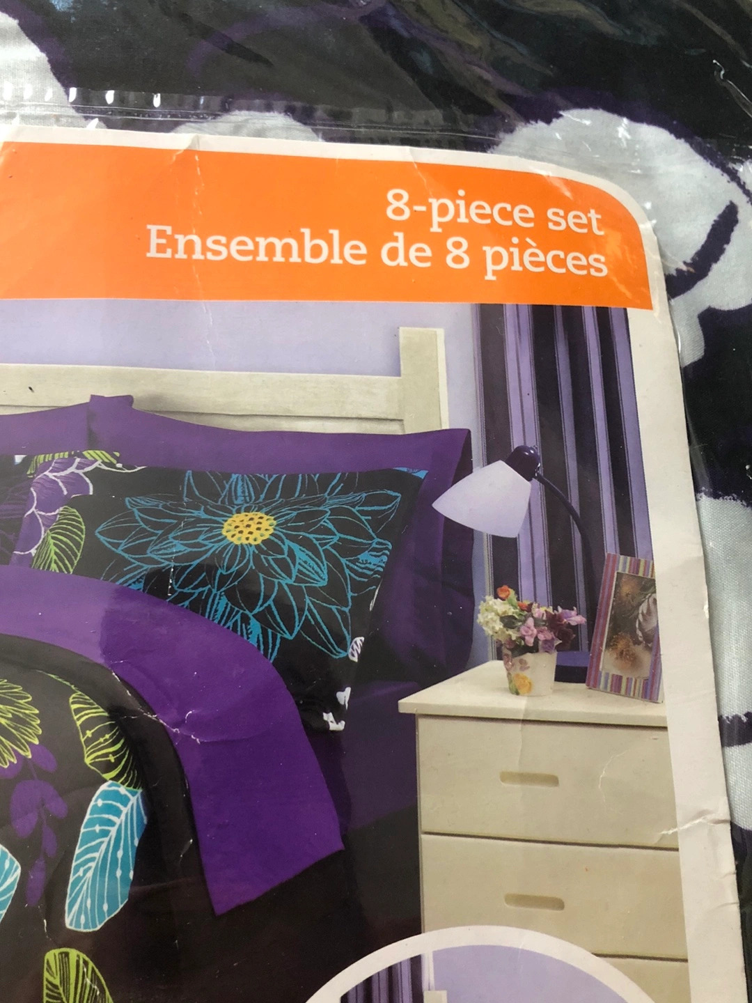 A bed in a bag set featuring a floral design. Includes a comforter, sheets, pillowcases, and more. You can sink into a peaceful sleep surrounded by beautiful flowers. Reversible 8 piece Double size