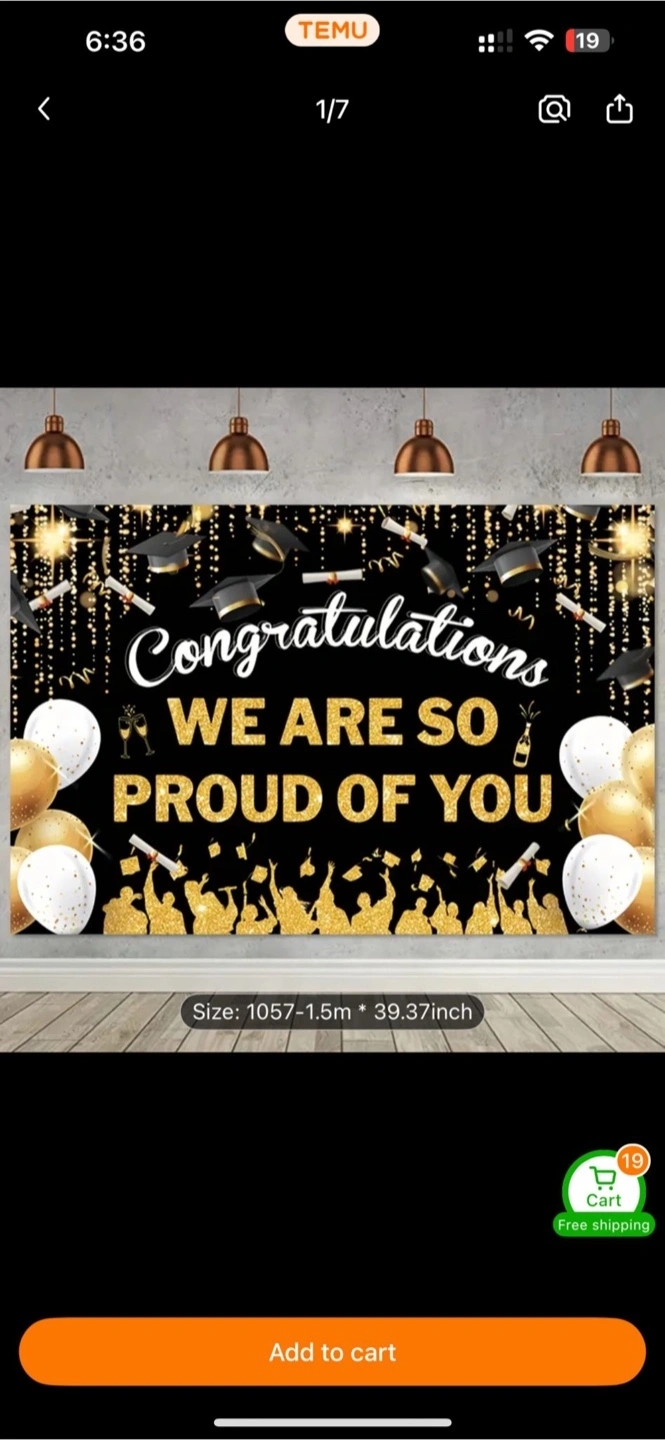 Black banner with gold and white lettering. Features graduation hats, balloons, and confetti. It is a perfect banner for a graduation party, creating a lovely atmosphere to cherish the special day.
