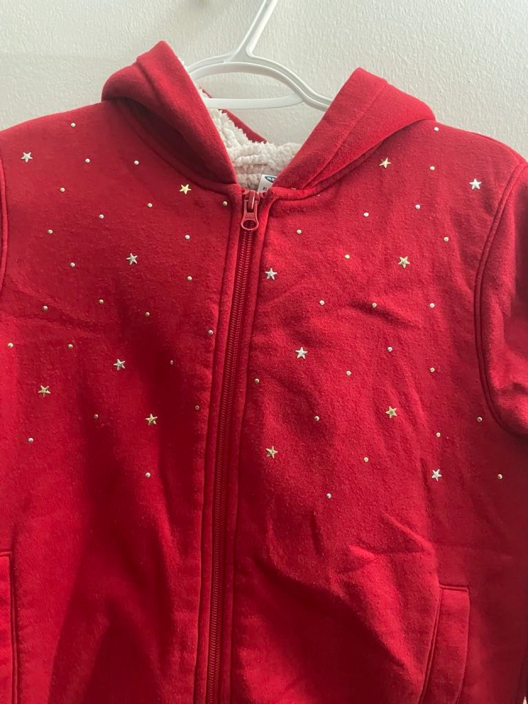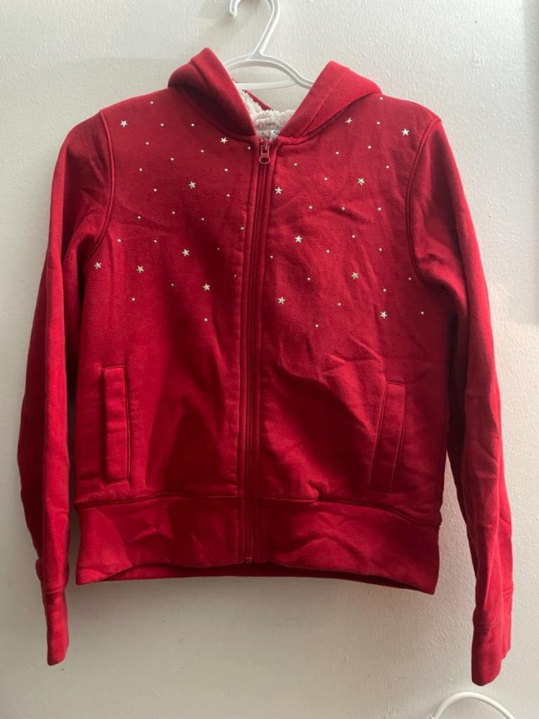 Red hoodie with front zipper. Features star embellishments. Has a lined hood and pockets. Perfect for a cozy afternoon read.