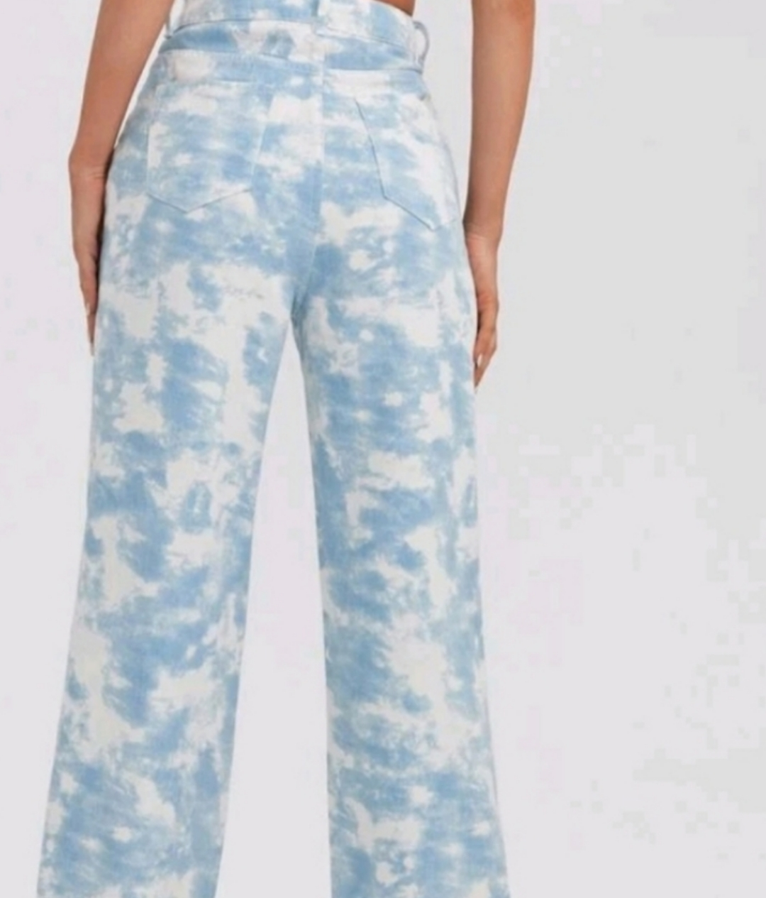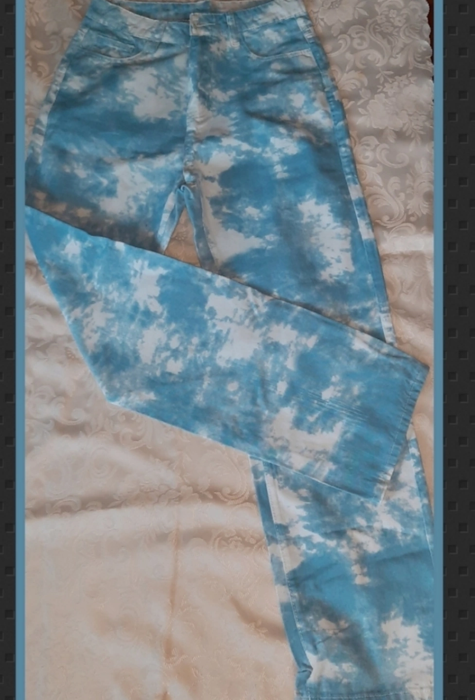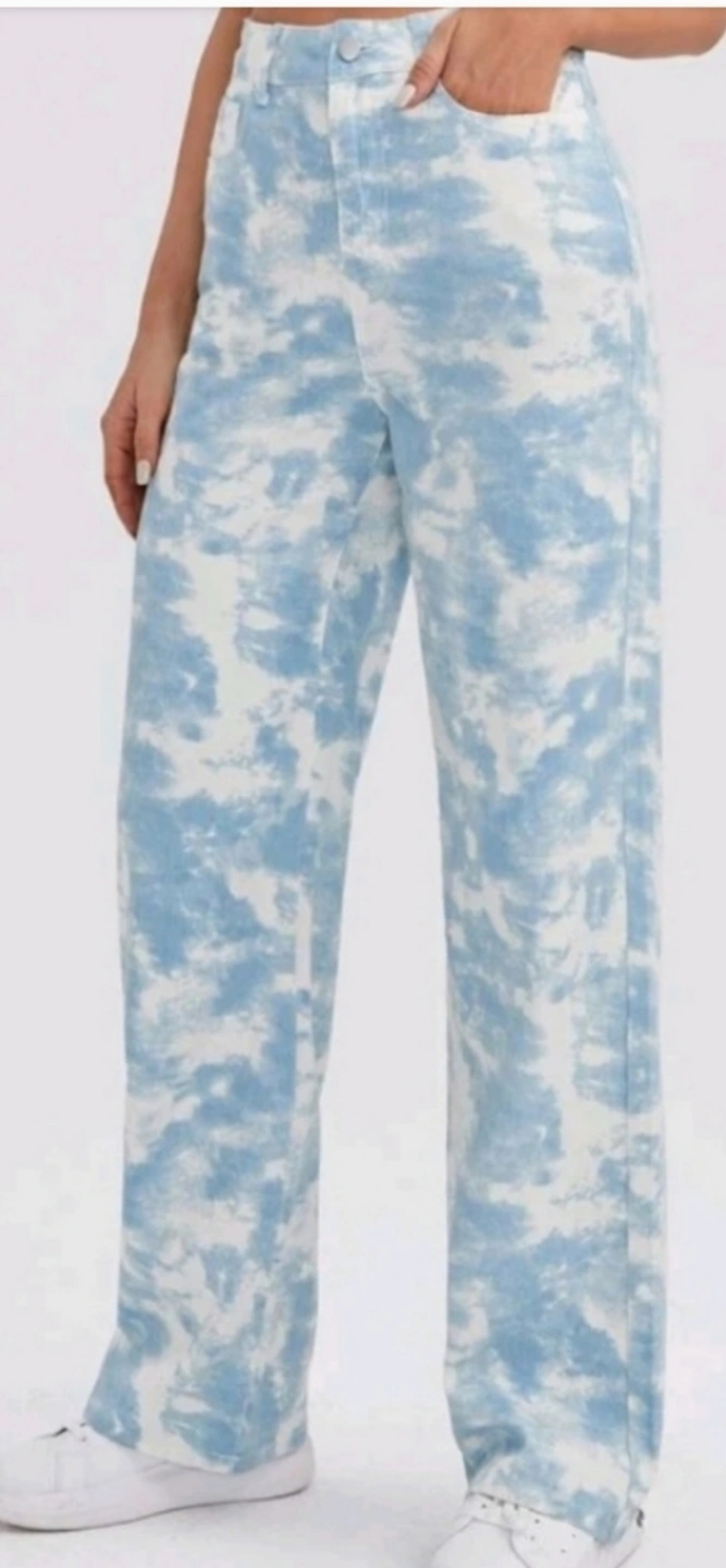 Loose fit jeans. Features a sky blue tie dye pattern. Perfect for a casual day out. These jeans will make a wonderful addition to any wardrobe and can be worn on a sunny day.