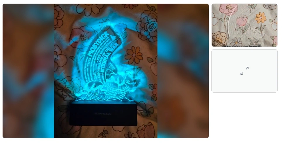 Illuminate your space with this unique Moby Dick desk decorative lamp. Featuring an acrylic laser-engraved panel that beautifully depicts the classic novel, this lamp glows in a vibrant blue when turned on. The sleek black base includes the phrase "Born to Read," making it a perfect gift for book lovers or literature enthusiasts. Great for use as a nightlight, desk lamp, or stylish decor piece. Key Features: Laser-engraved acrylic panel: Intricate Moby Dick themed design. LED illumination: Emits a 3-level bright blue glow when powered on. Touch control: Simple operation for easy lighting adjustment. USB-powered: Compatible with power banks, adapters, and laptop USB ports. Multipurpose use: Ideal for bedrooms, offices, reading nooks, or display shelves. Special Offer: Get an additional $2 discount for each additional item purchased from my listing. For example, buy 2 items, get $2 off; buy 3 items, get $4 off, and so on!