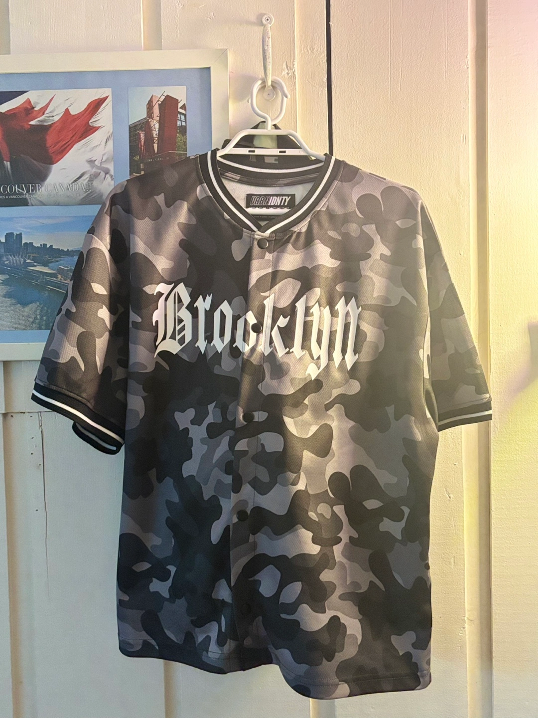 NEVER USED Jersey, with a button-down front. Features a camouflage pattern. The word “Brooklyn” is across the chest. Consider wearing this item while you read a good book.
