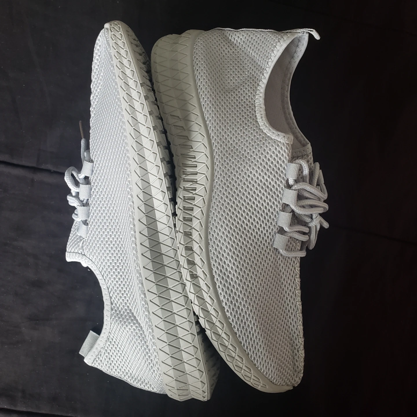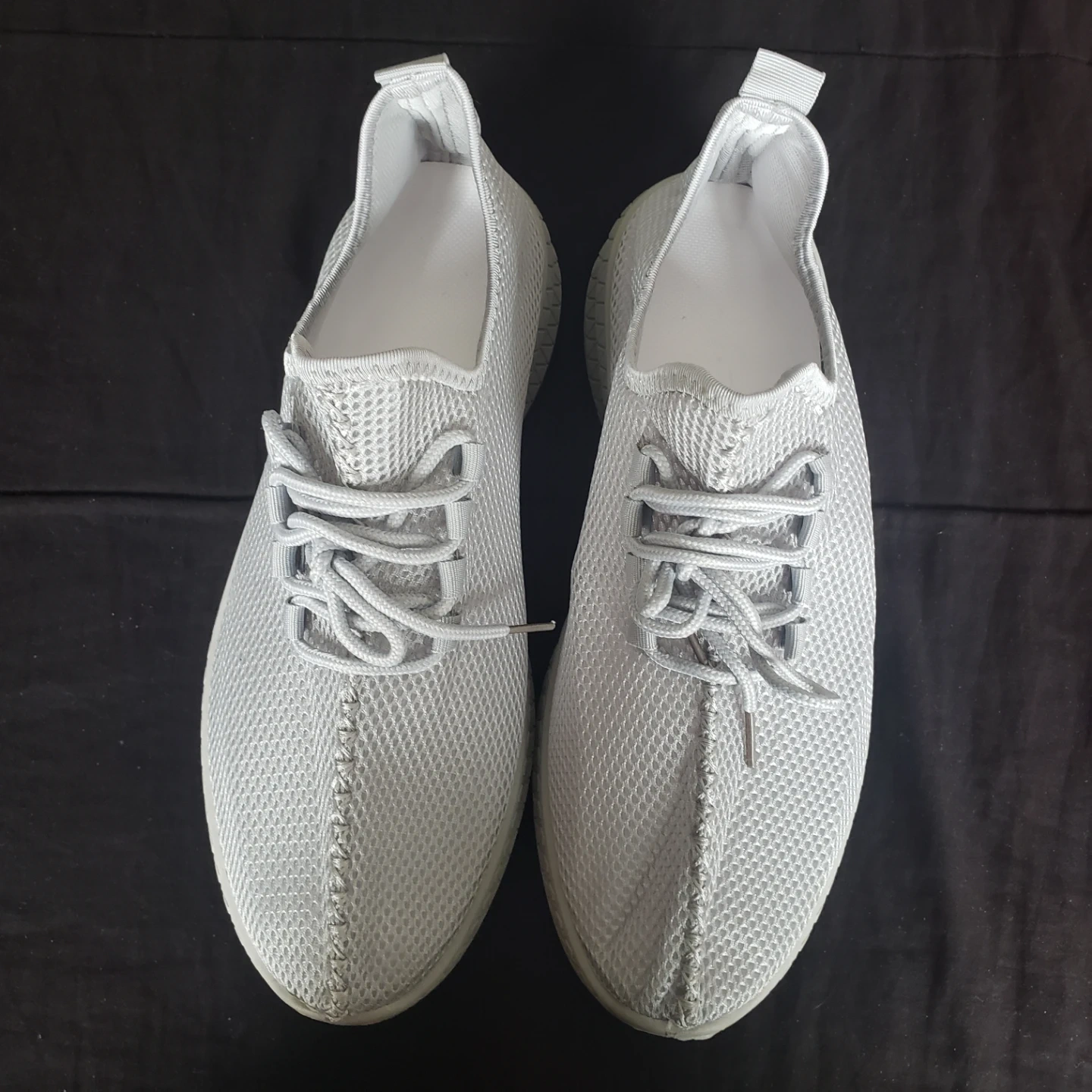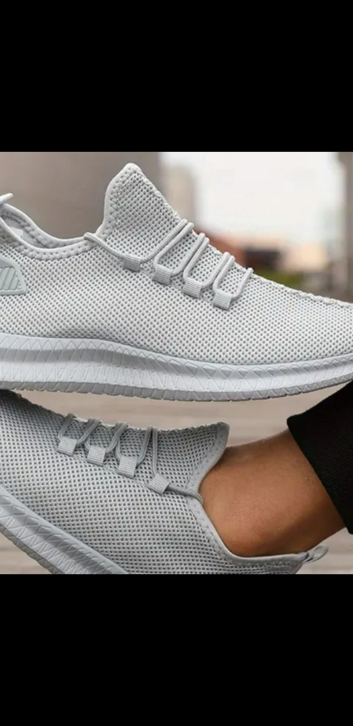 Light grey athletic shoes. Lace-up sneakers. Designed with breathable mesh fabric.