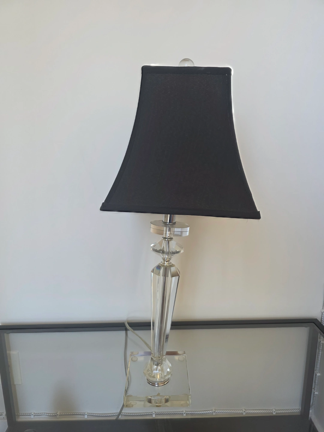 Table lamp with a black shade. The base is made of crystal with a clear square base. Place this lamp on your nightstand to wind down before bed.