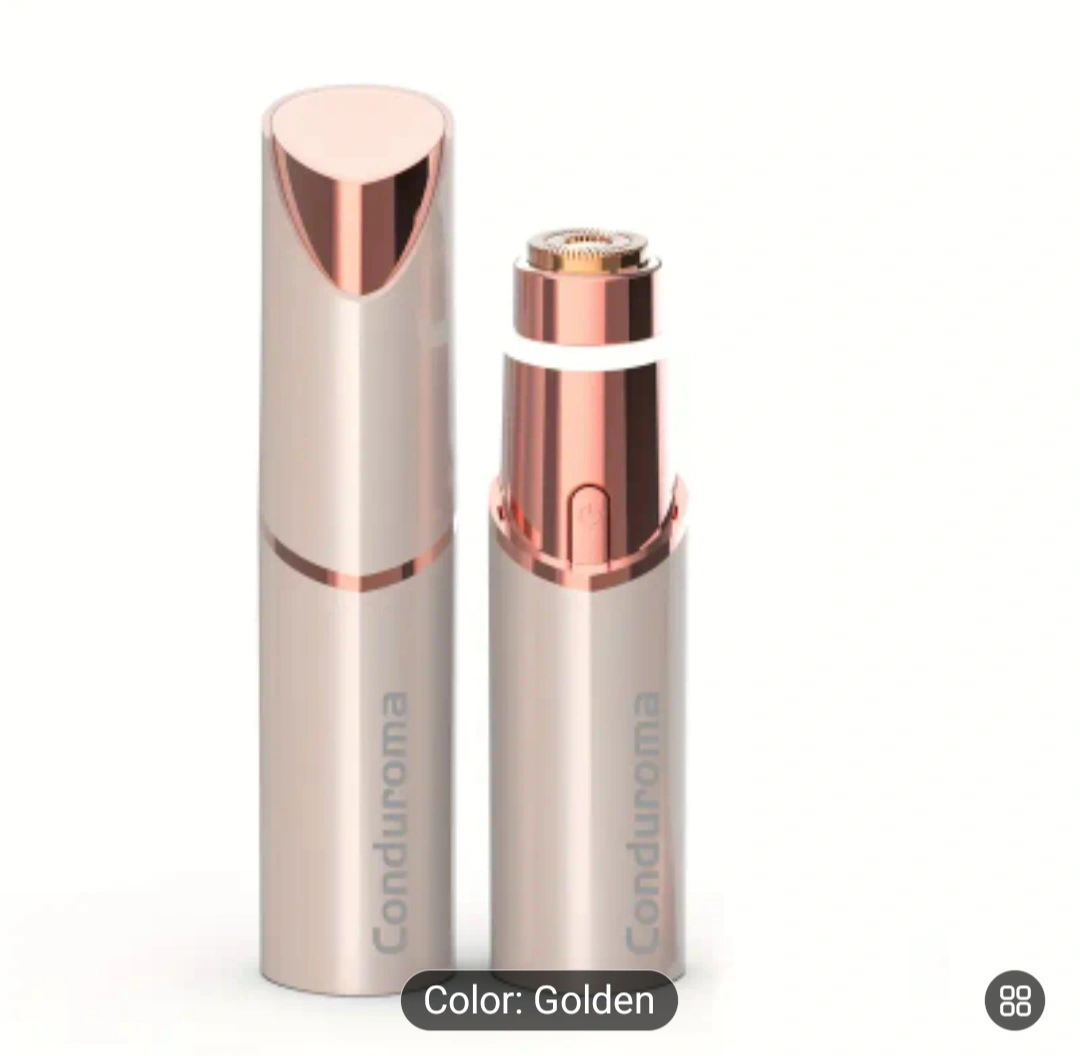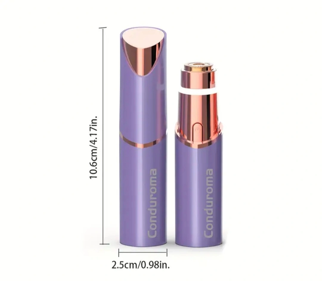 Facial hair remover. With a sleek, metallic design. The device features a protective cap. Great for an easy, stress-free way to remove unwanted hair.