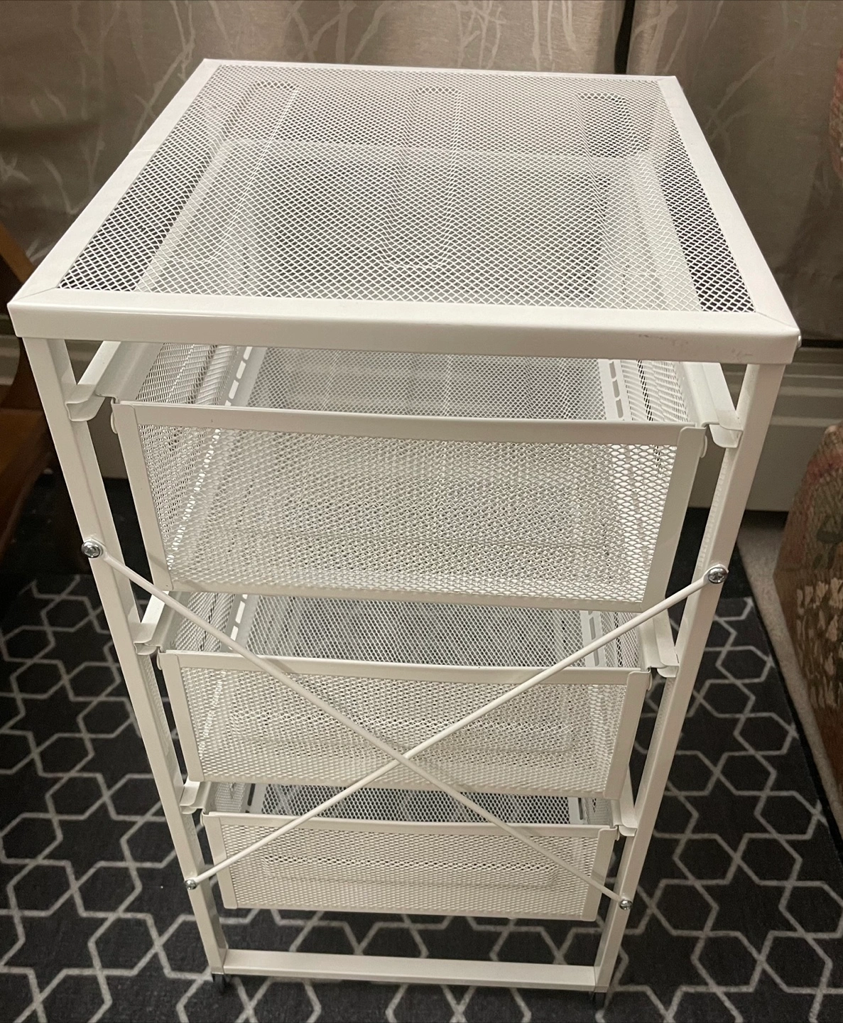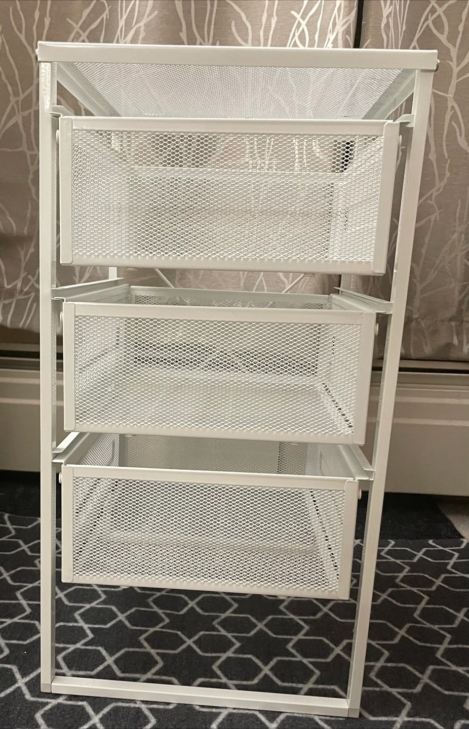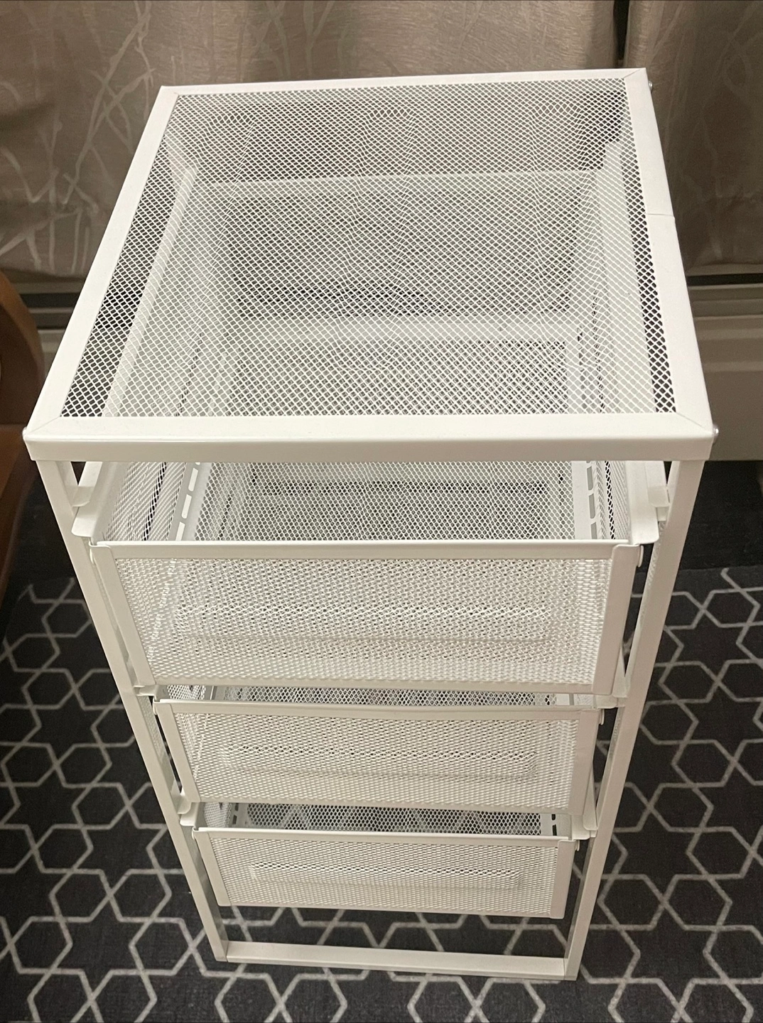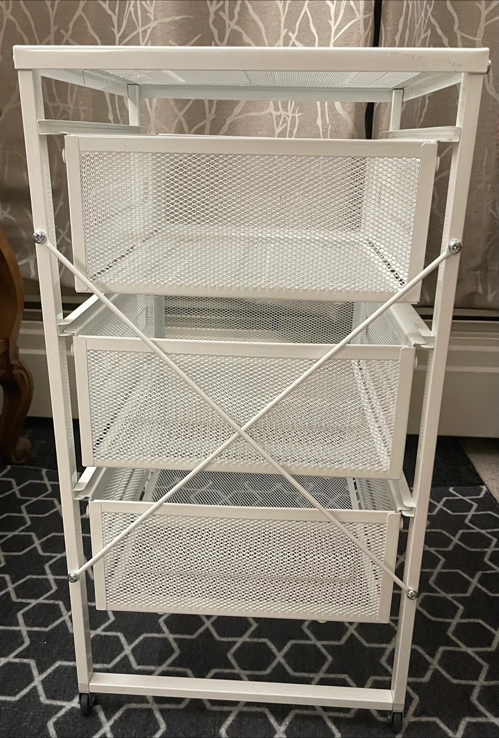 IKEA White metal frame cart. Features three mesh baskets / drawers and a top shelf. Two wheels at the base for easy moving. Perfect for keeping your space organized and tidy. Rarely used. Excellent condition.