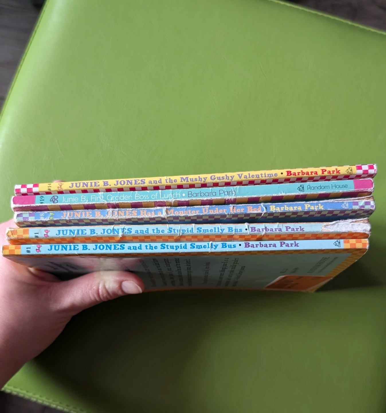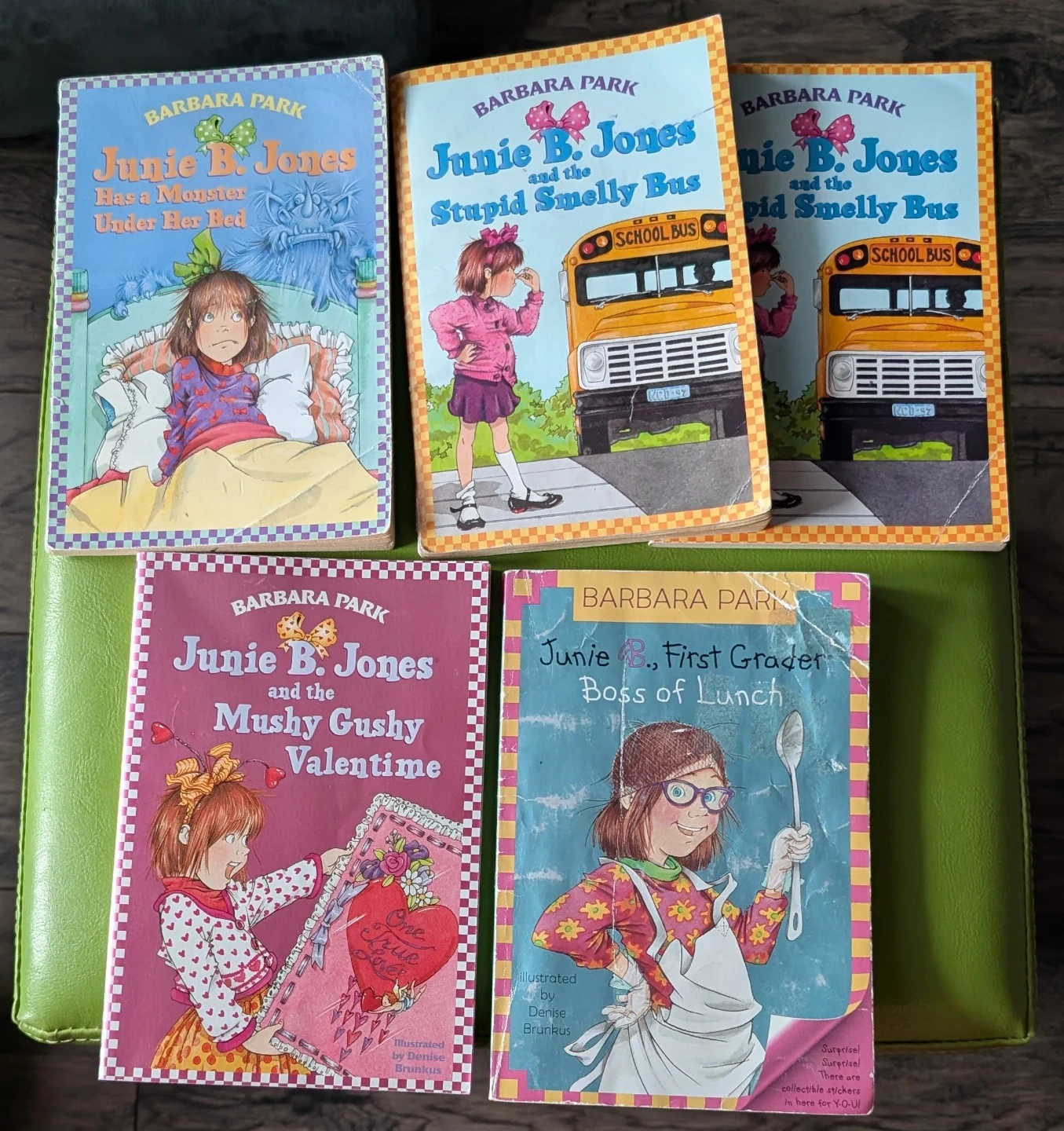 Four Junie B. Jones books by Barbara Park. Includes 'Junie B. Jones and the Mushy Gushy Valentine', 'Junie B. First Grader: Boss of Lunch', and two copies of 'Junie B. Jones and the Stupid Smelly Bus'. These children's books are perfect for young readers.