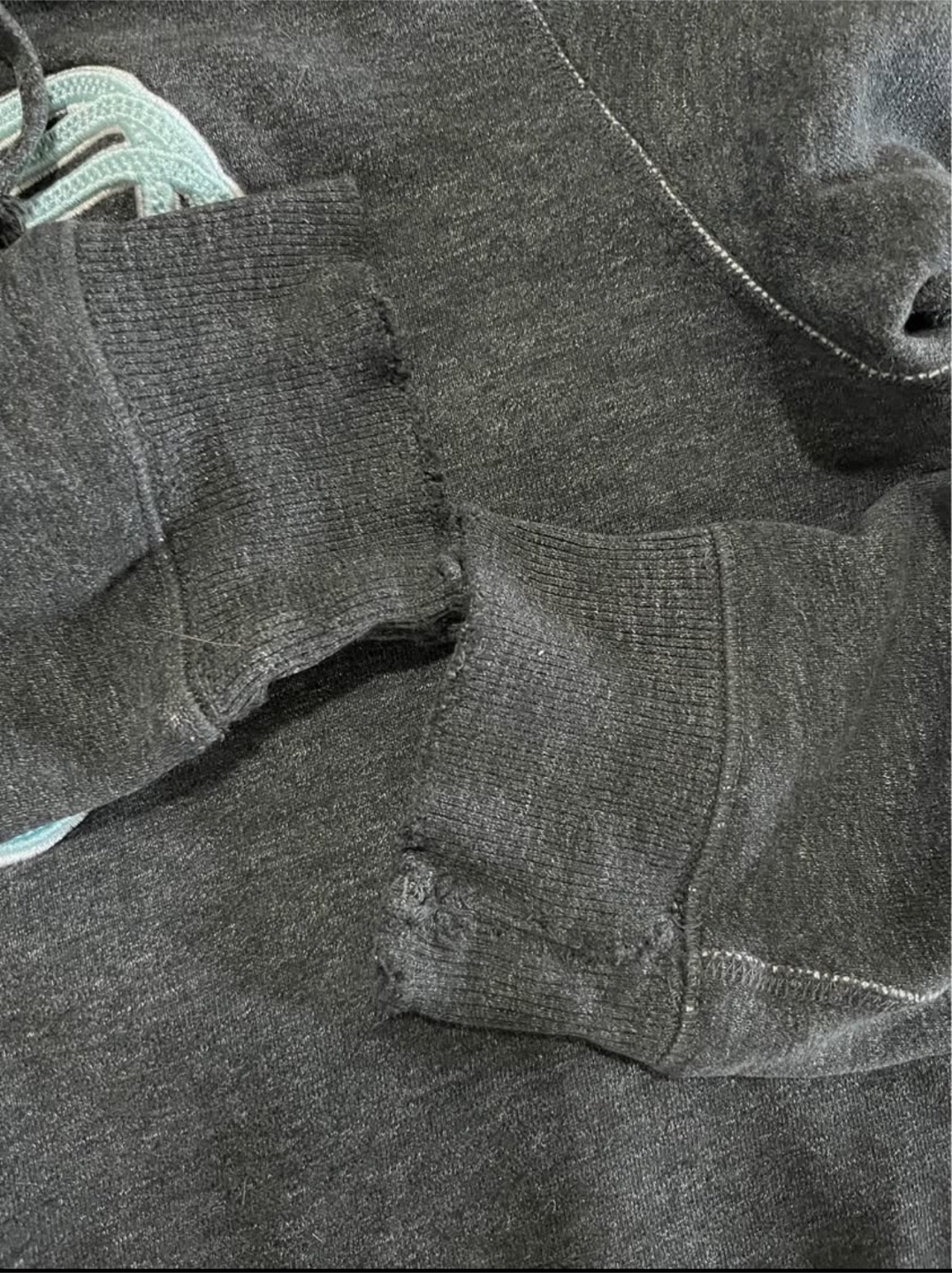 Great condition overall. Some fraying at the ends of the sleeve cuffs (see pic #3). Really nice thick material. Gray with light teal embroidered logo on the front.