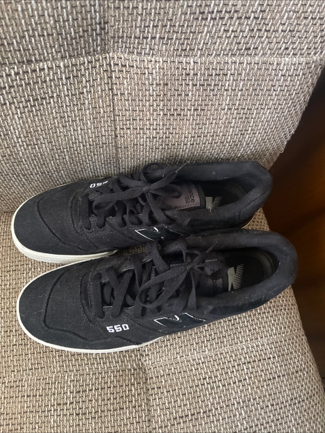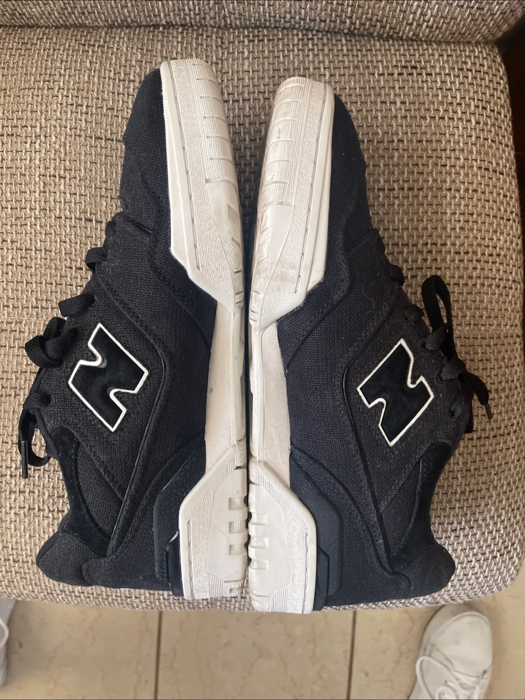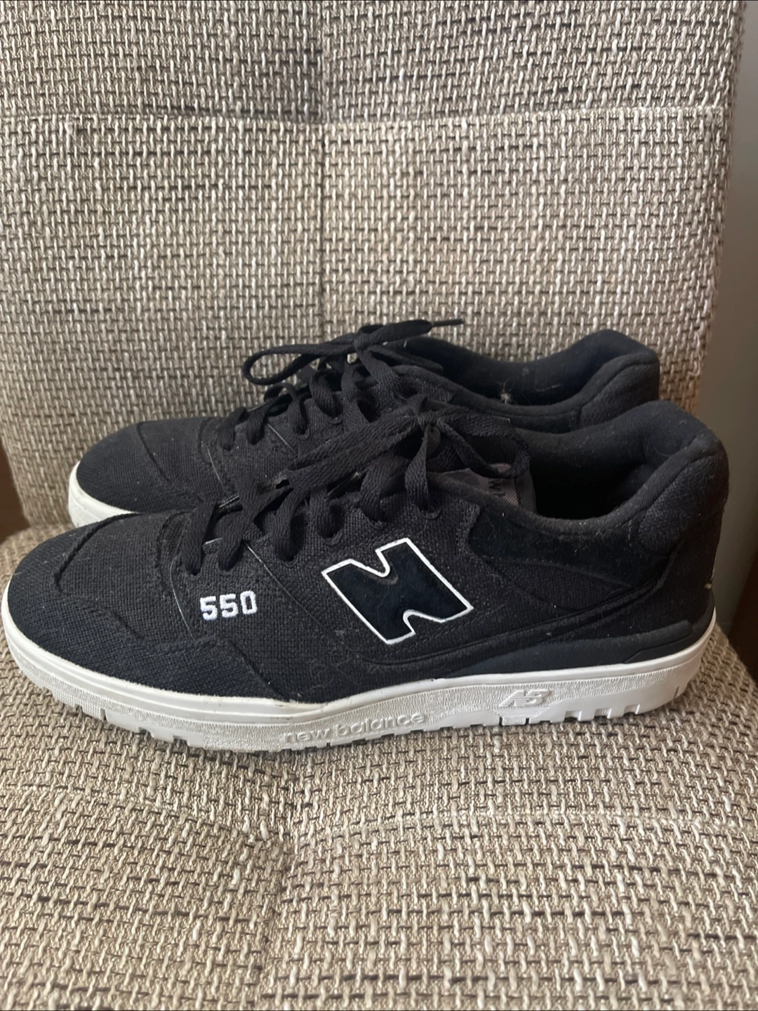 Black sneakers with white soles. Laces on the top. The classic look is great for casual outings.
