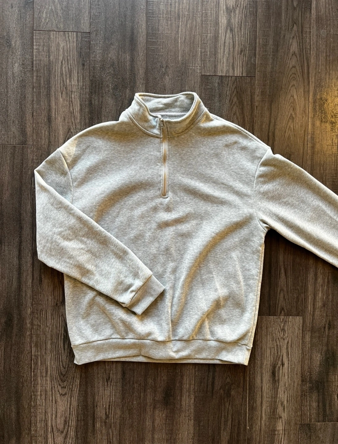 Grey sweatshirt. Features a quarter-zip closure. Long sleeves. Great for a cozy night in.