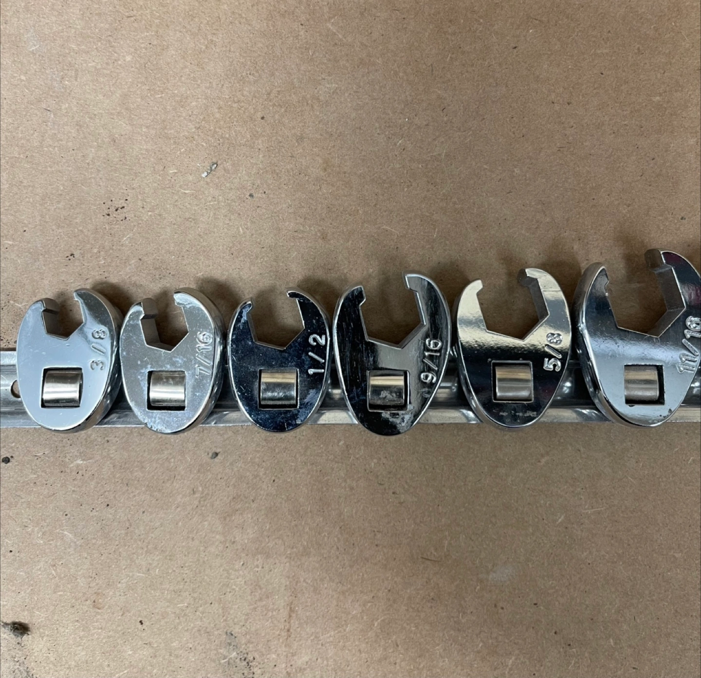 Mechanic, crowfoot Wrench set on a rail. Silver wrenches. Sizes written on each wrench. A great set to have in your toolbox for any projects you may have.