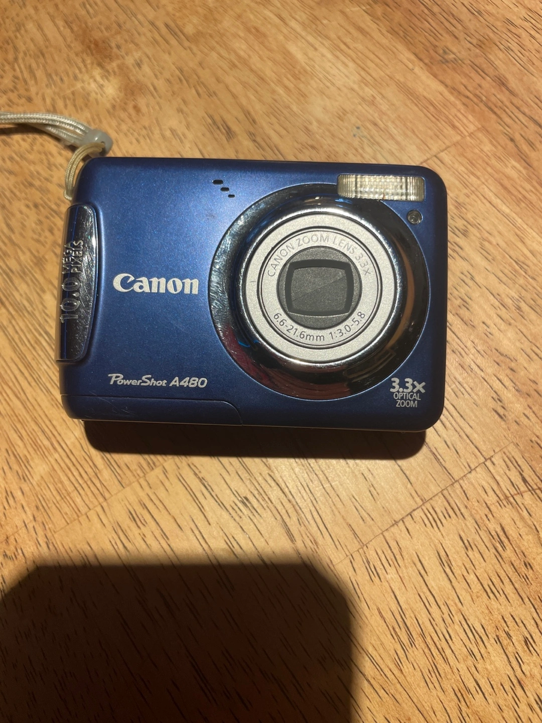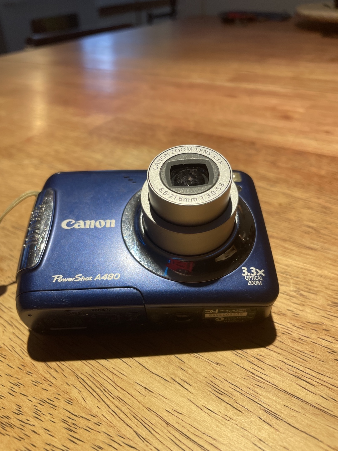 Canon compact digital camera. Comes in blue. Includes a zoom lens. With attached strap. AA battery powered. No SD card. Solid as a rock and easy to use. Don't risk your phone being dropped or damaged and in some cases stolen, this camera will take just as good pics and video as most smartphones.