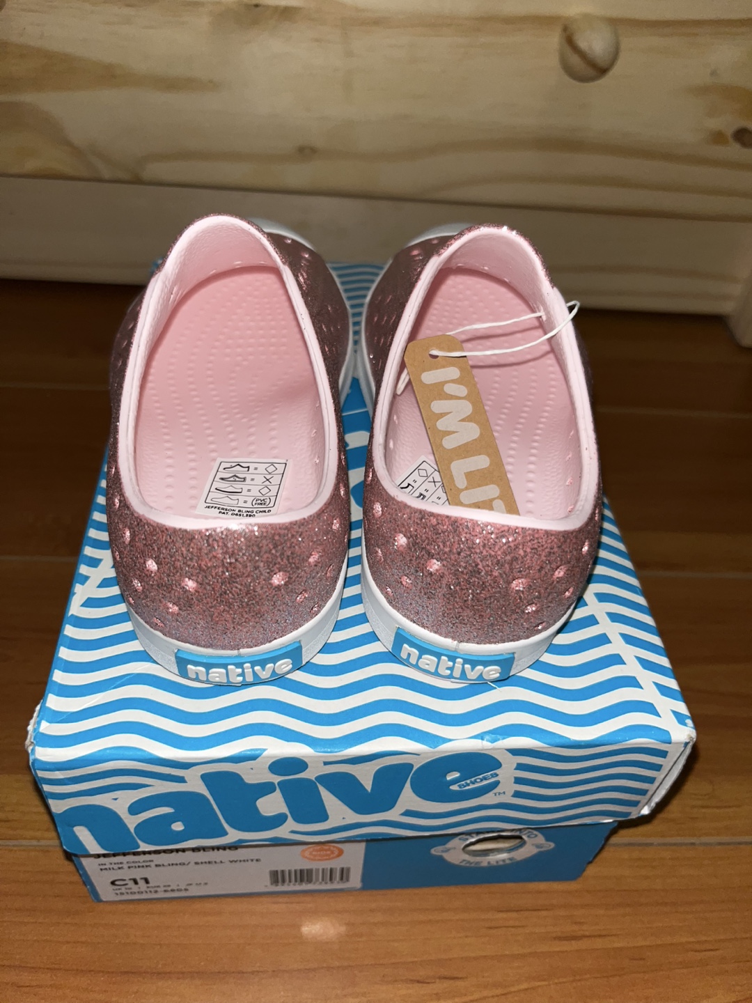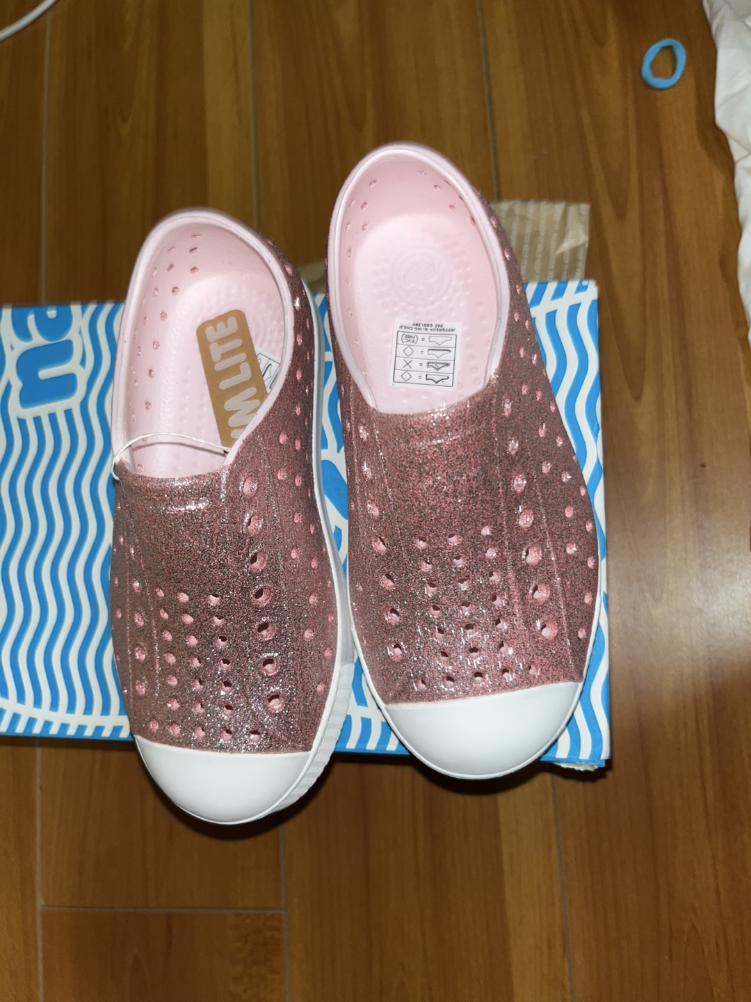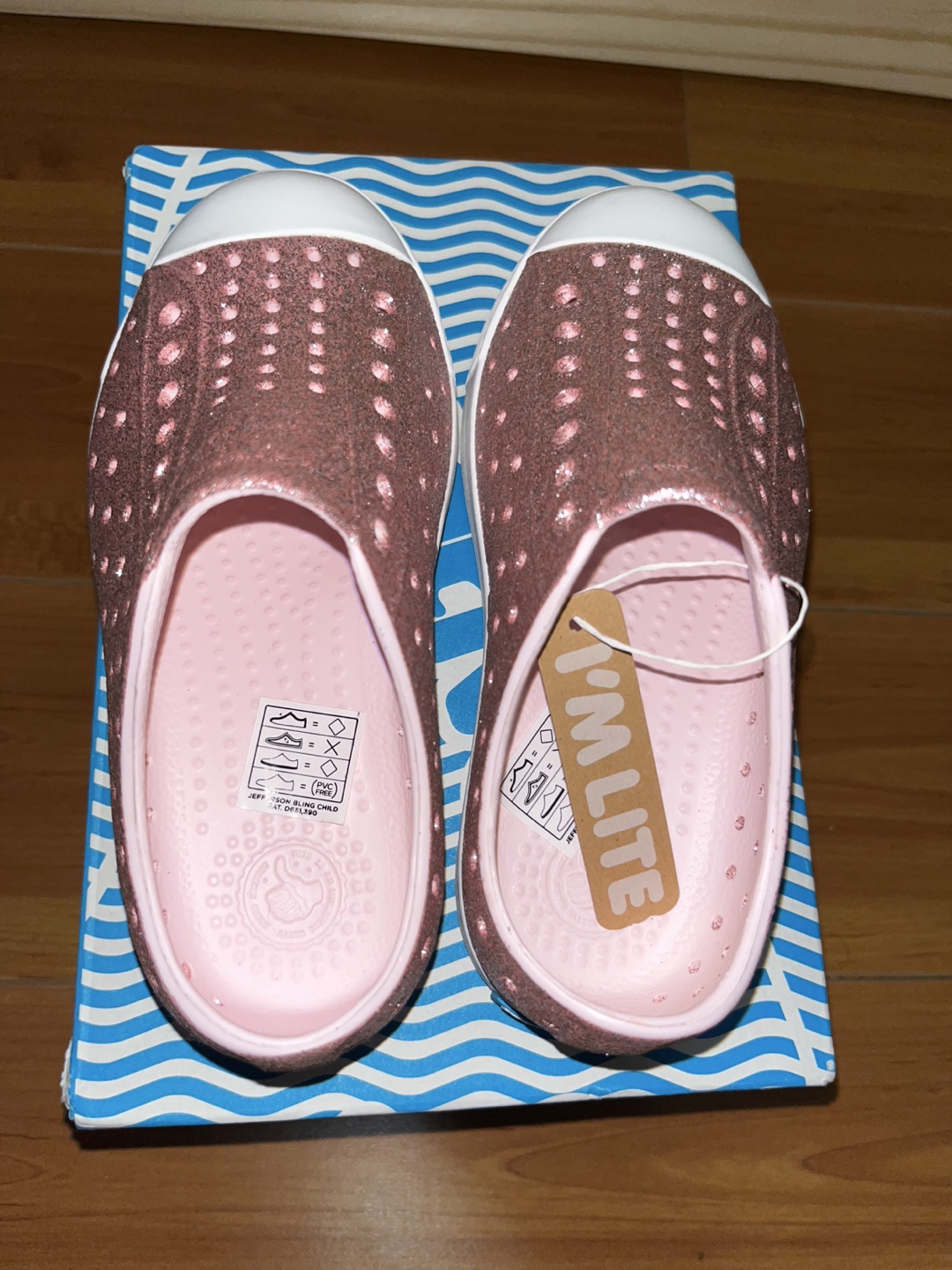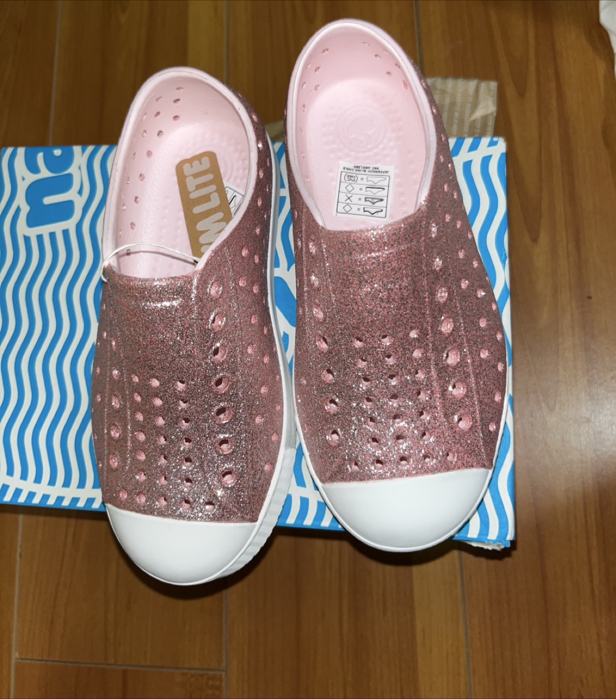 Pink sparkly shoes with holes. Come with a box. A great pair of shoes to lounge in on a relaxing day. Selling brand new comes with the box ,cute colour Pink🩷