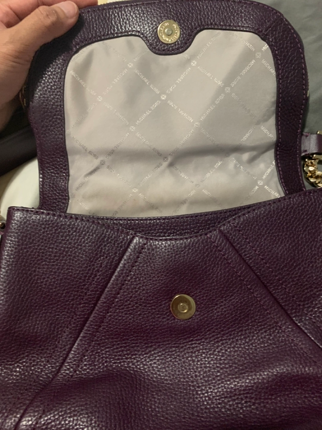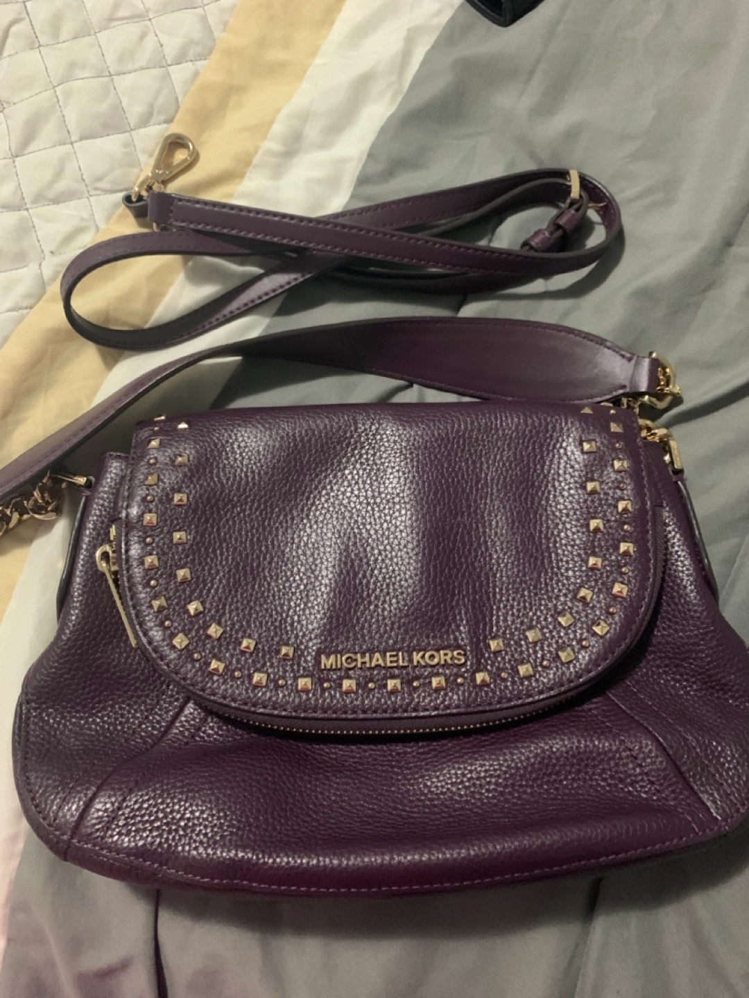 Purple shoulder bag with a flap closure. Features a gold chain strap, and gold studded accents. Comes with a detachable crossbody strap. Keep all your essentials secure within.