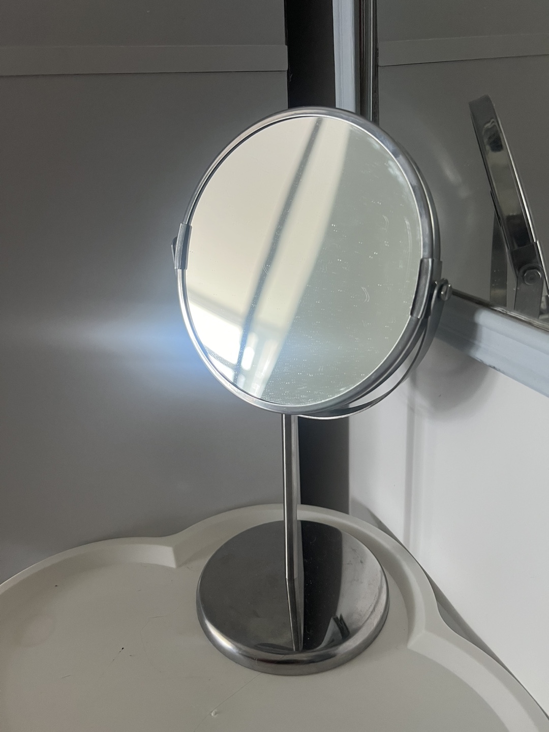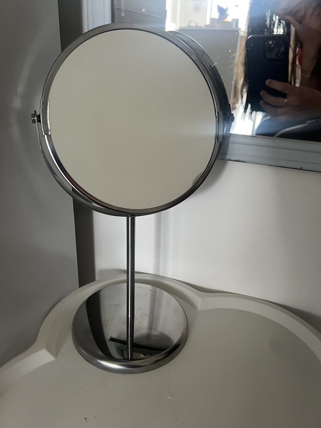 Vanity mirror with a round shape. Features a circular base and a stand. Great for applying makeup in the morning. Might need tighting a screw, but is fully functional