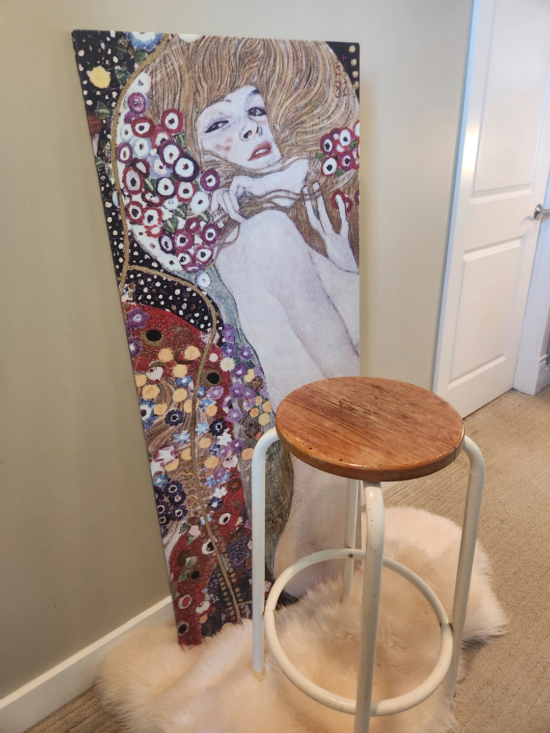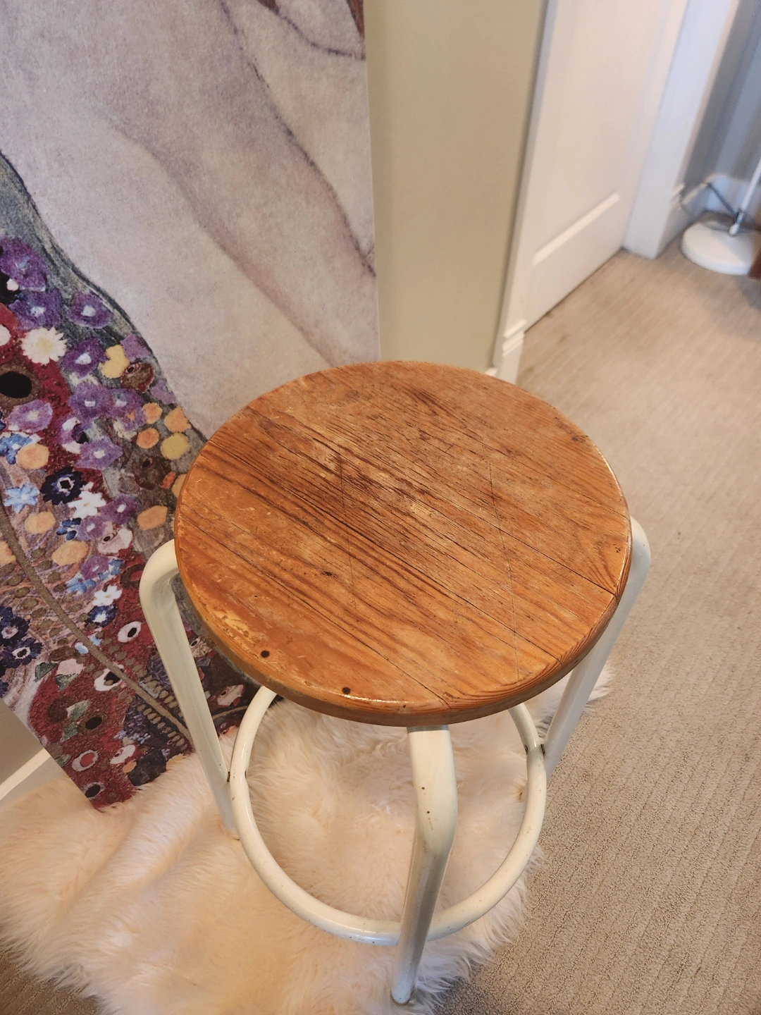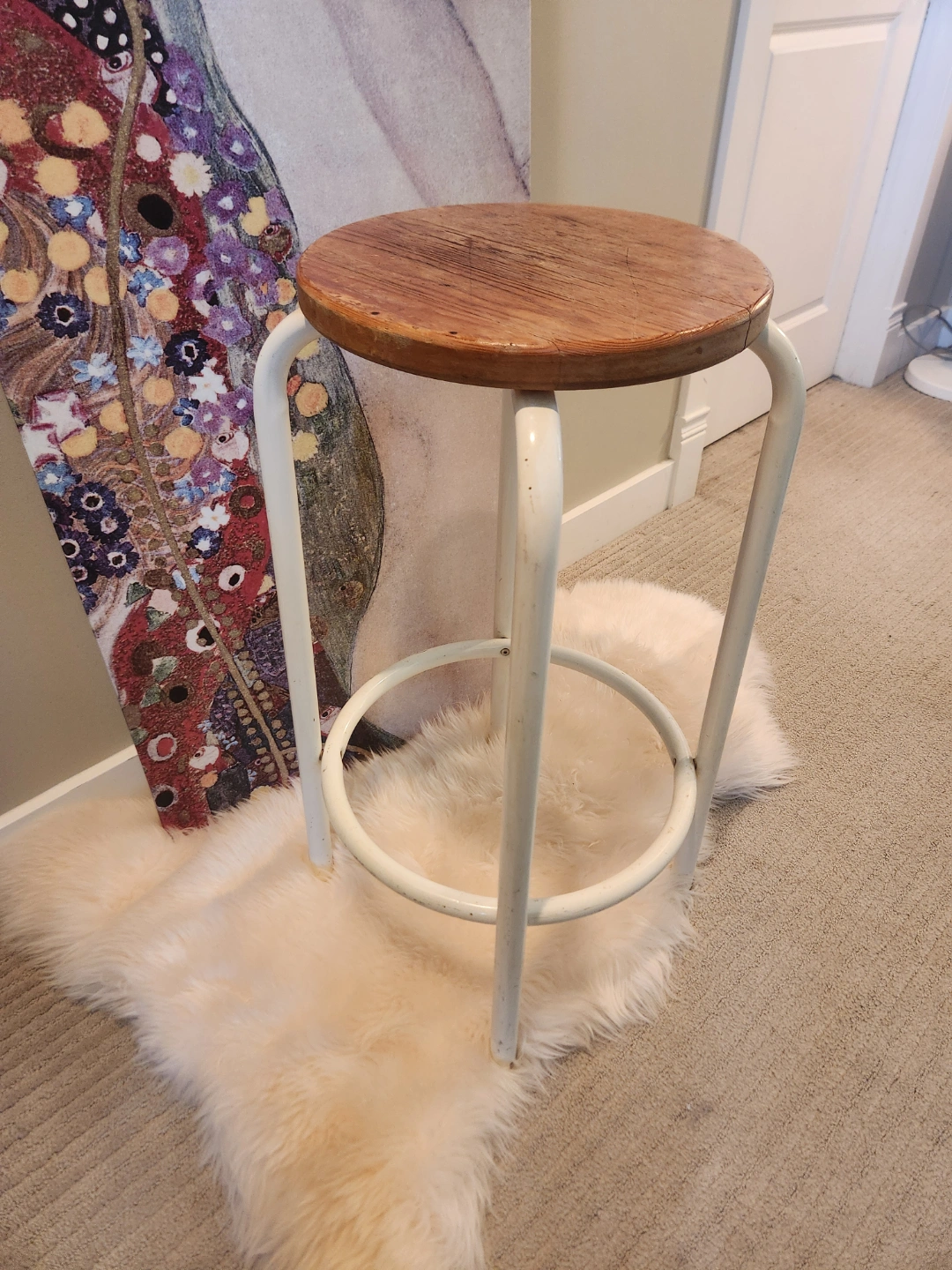 80's ALERT! Wooden top with a metal frame. Stool features a footrest. It would make a perfect spot to rest after a long day. Great as a plant stand too! ALSO makes a great small space friendly drinks table or extra seating 30 inches high, seat is 13 inches diameter.