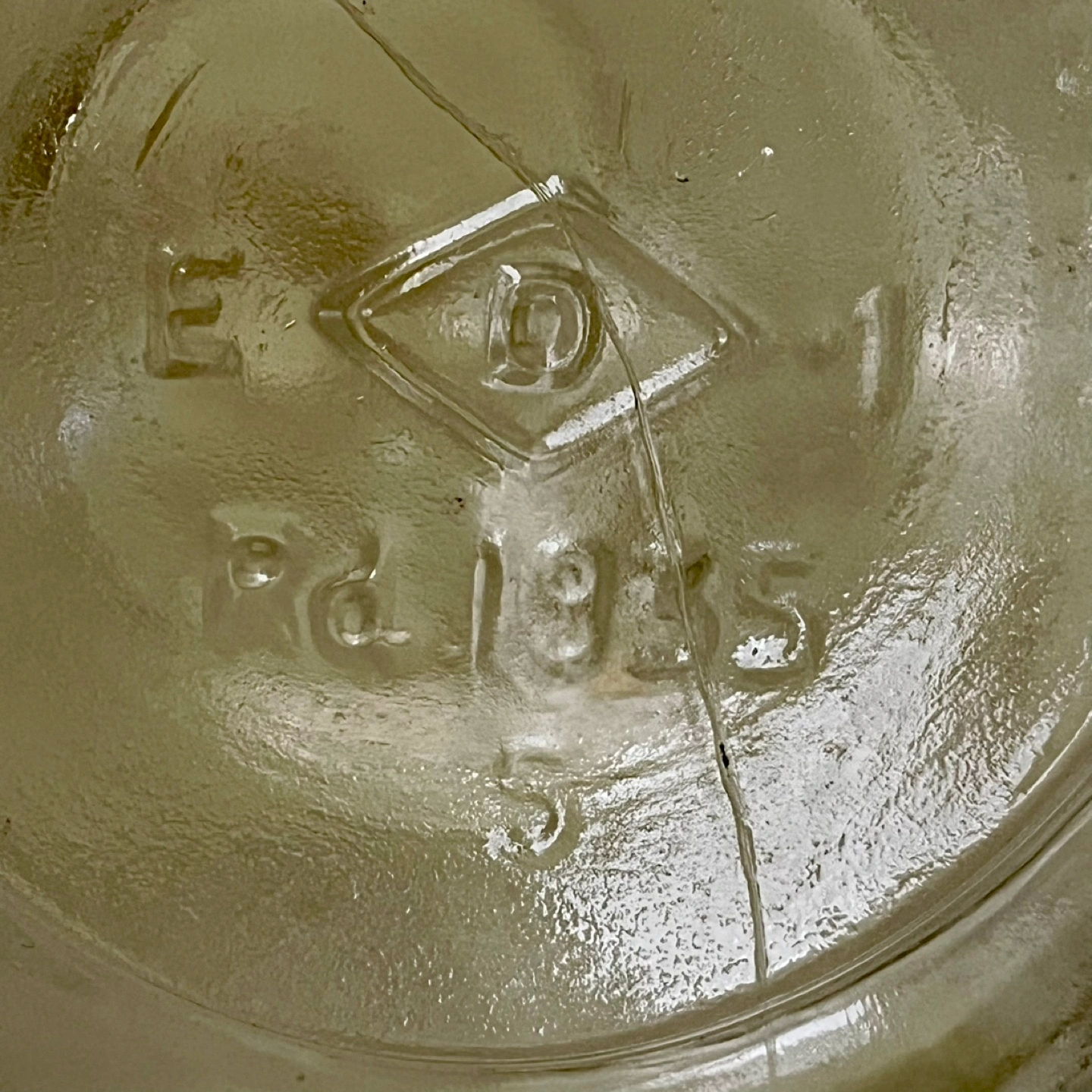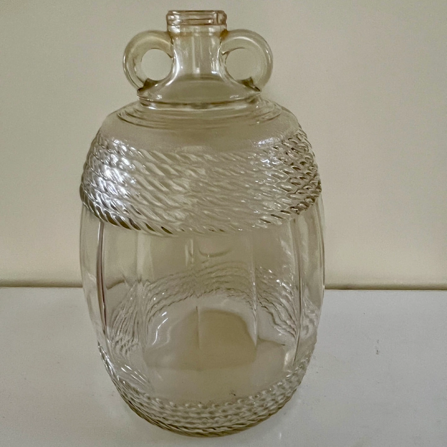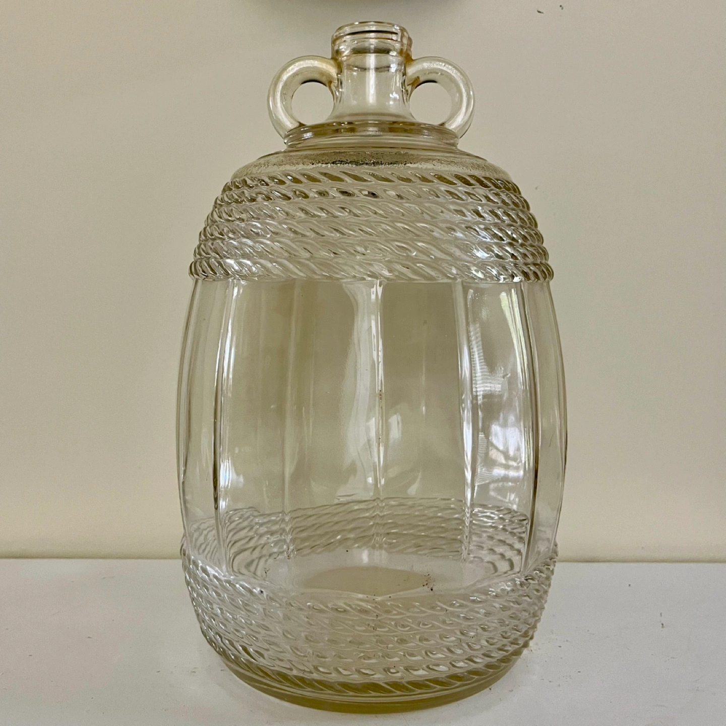 Vintage Dominion Glass Rd 1935 Gallon Jug with Double Finger Loop Handles. Clear Gallon Jug with Braided Rope & Embossed Textured Detail. Crack on bottom exterior but was tested and dows not leak.