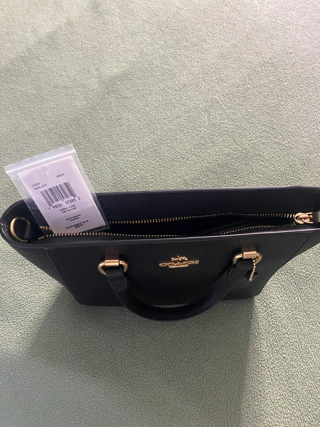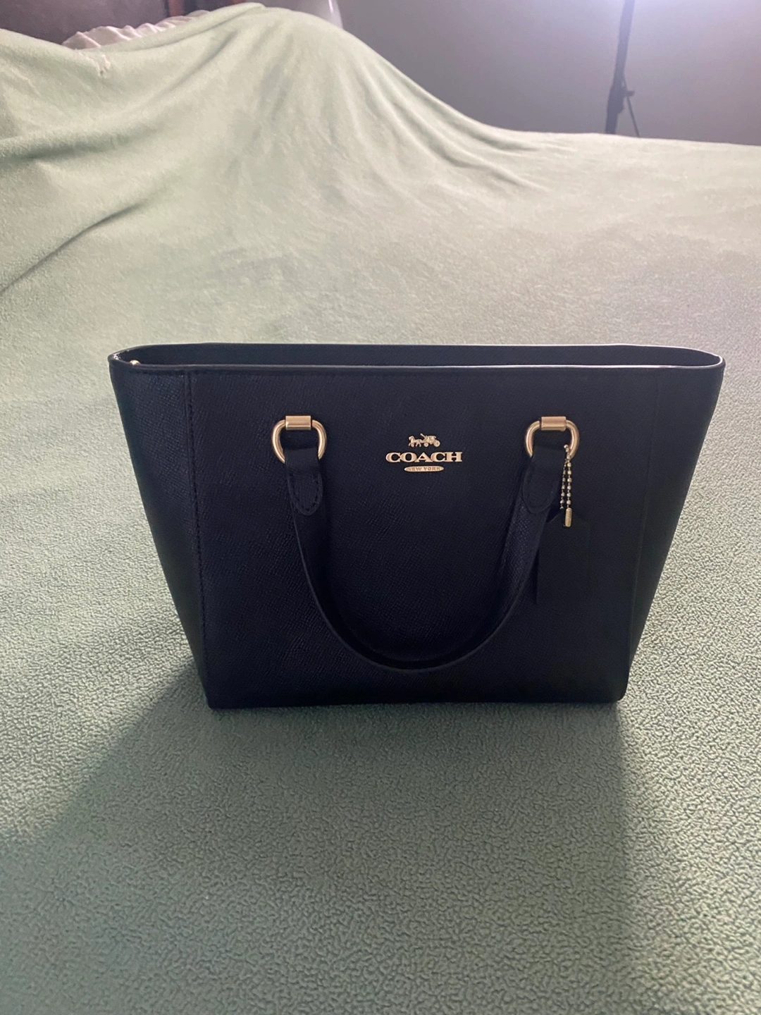 Black handbag. Featuring gold accents. Has a zip closure. Ideal for carrying personal belongings to work or school.