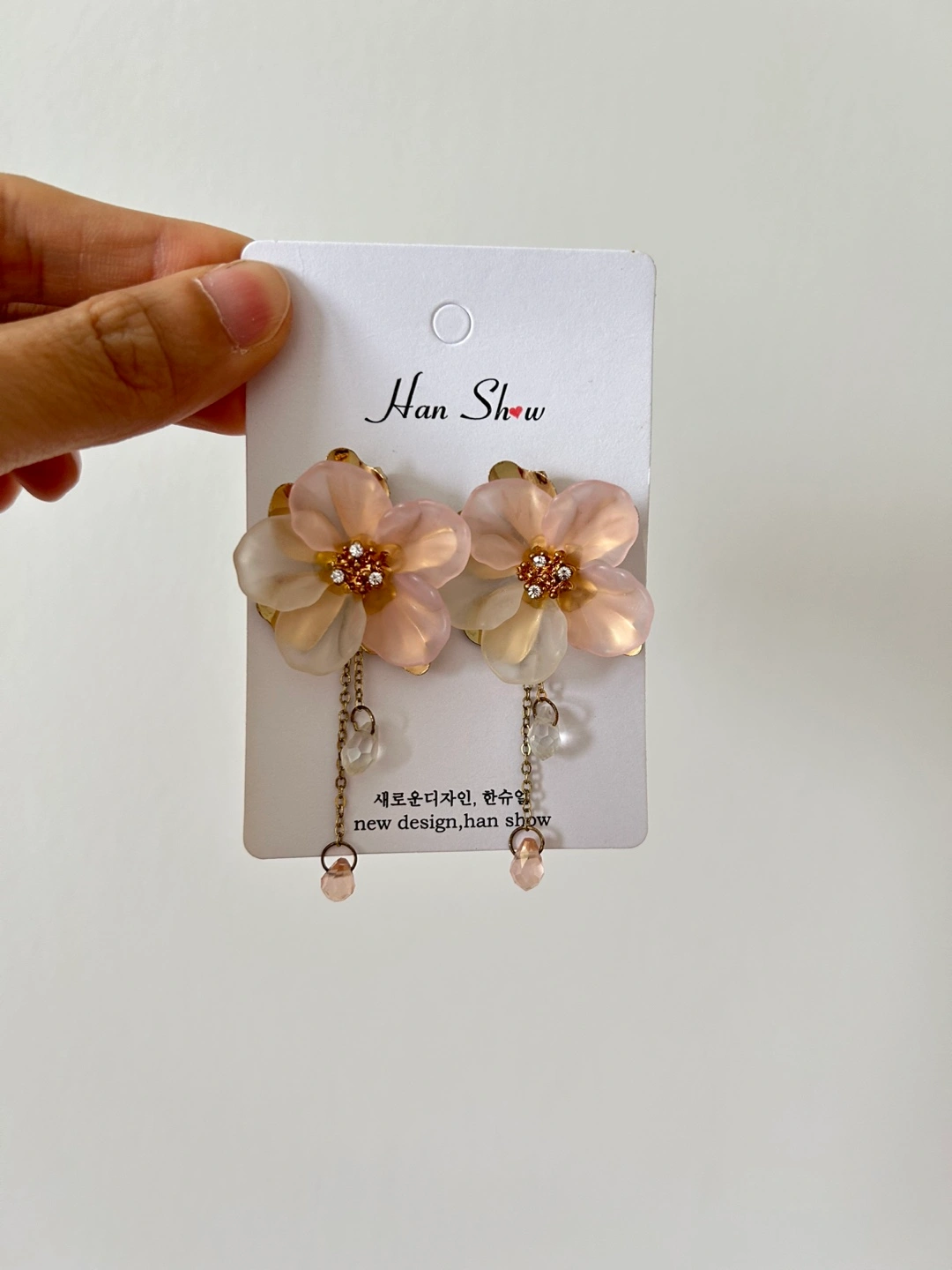 118Earrings in a floral shape. Featuring hanging chains and small gems. Perfect to wear on a quiet evening.