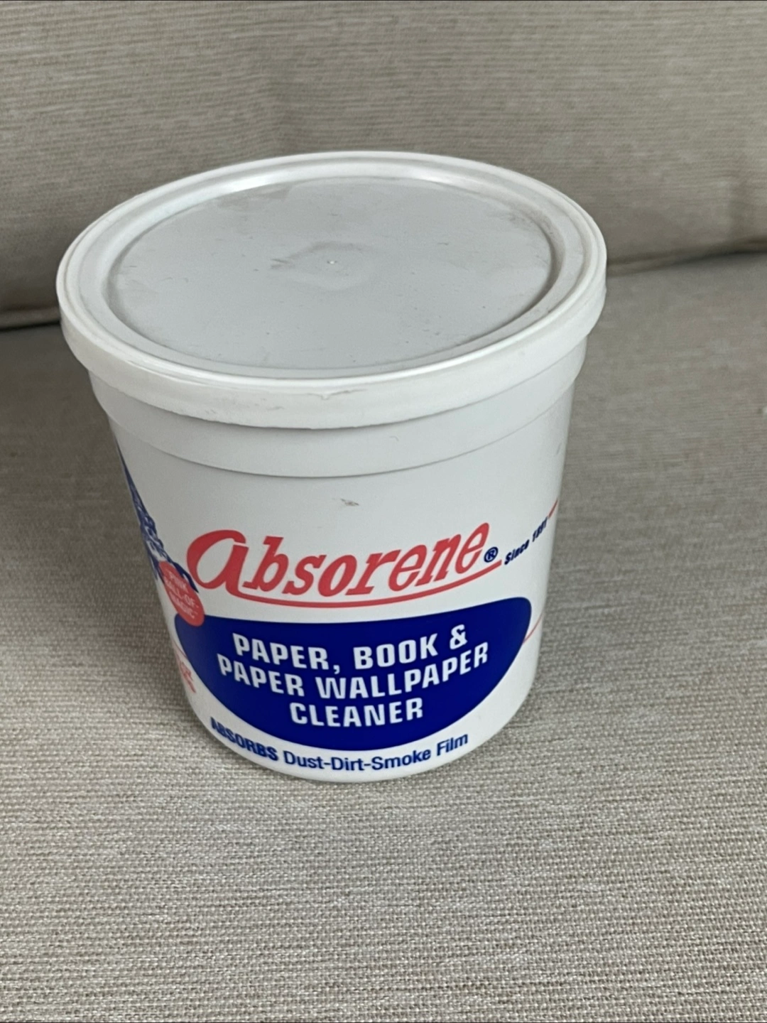 The product cleans paper, books, and wallpaper. The label indicates it absorbs dust, dirt, and smoke film. The container is sitting on top of a neutral coloured surface. Perfect for a calming afternoon of cleaning.