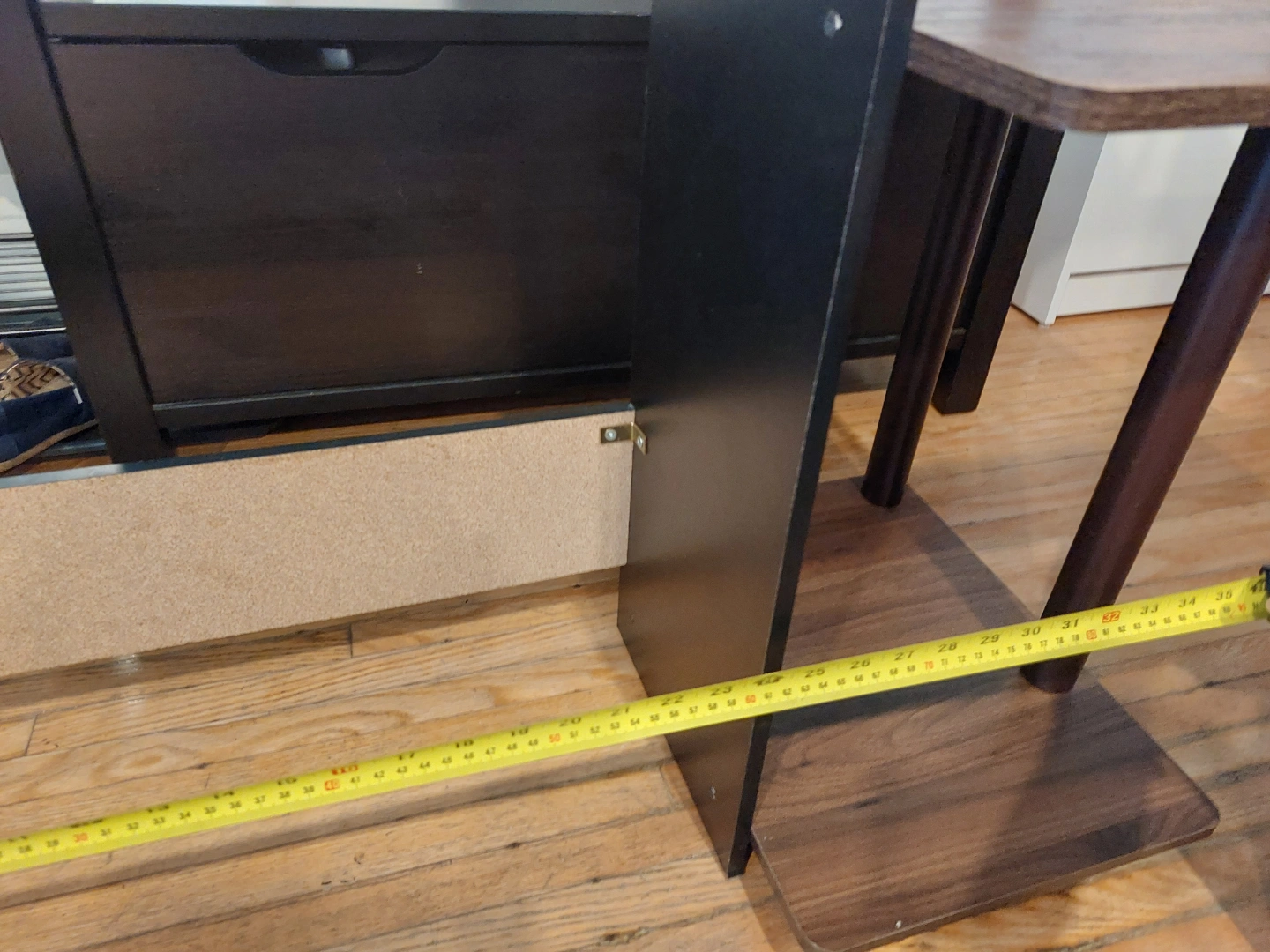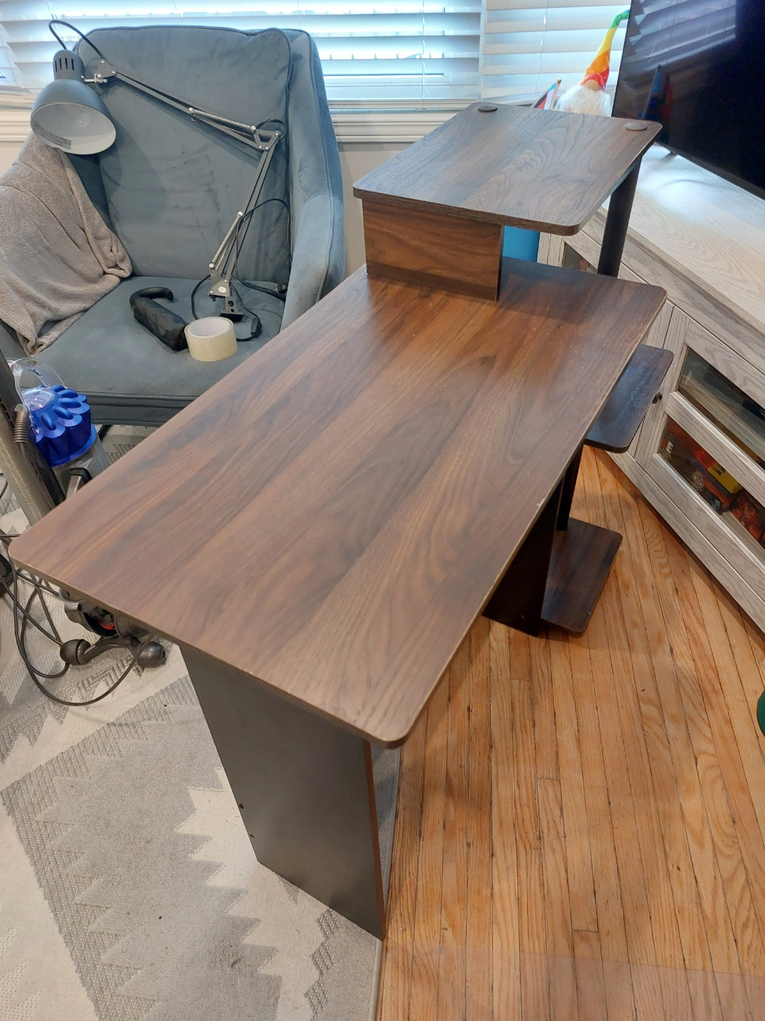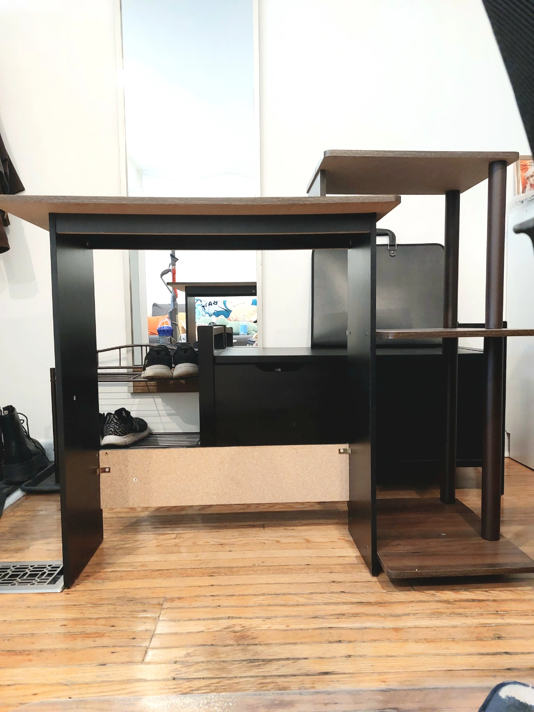 Compact, sturdy desk with dark wood grain finish. The shelves on the side offer extra storage or a space to fit your PC. Has minor wear and tear from use, but is in great shape overall. Good for small apartments and home office.