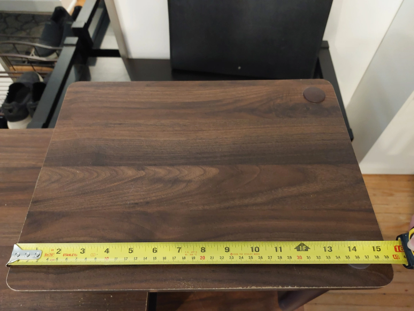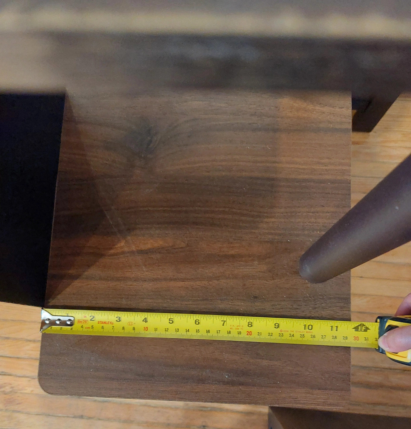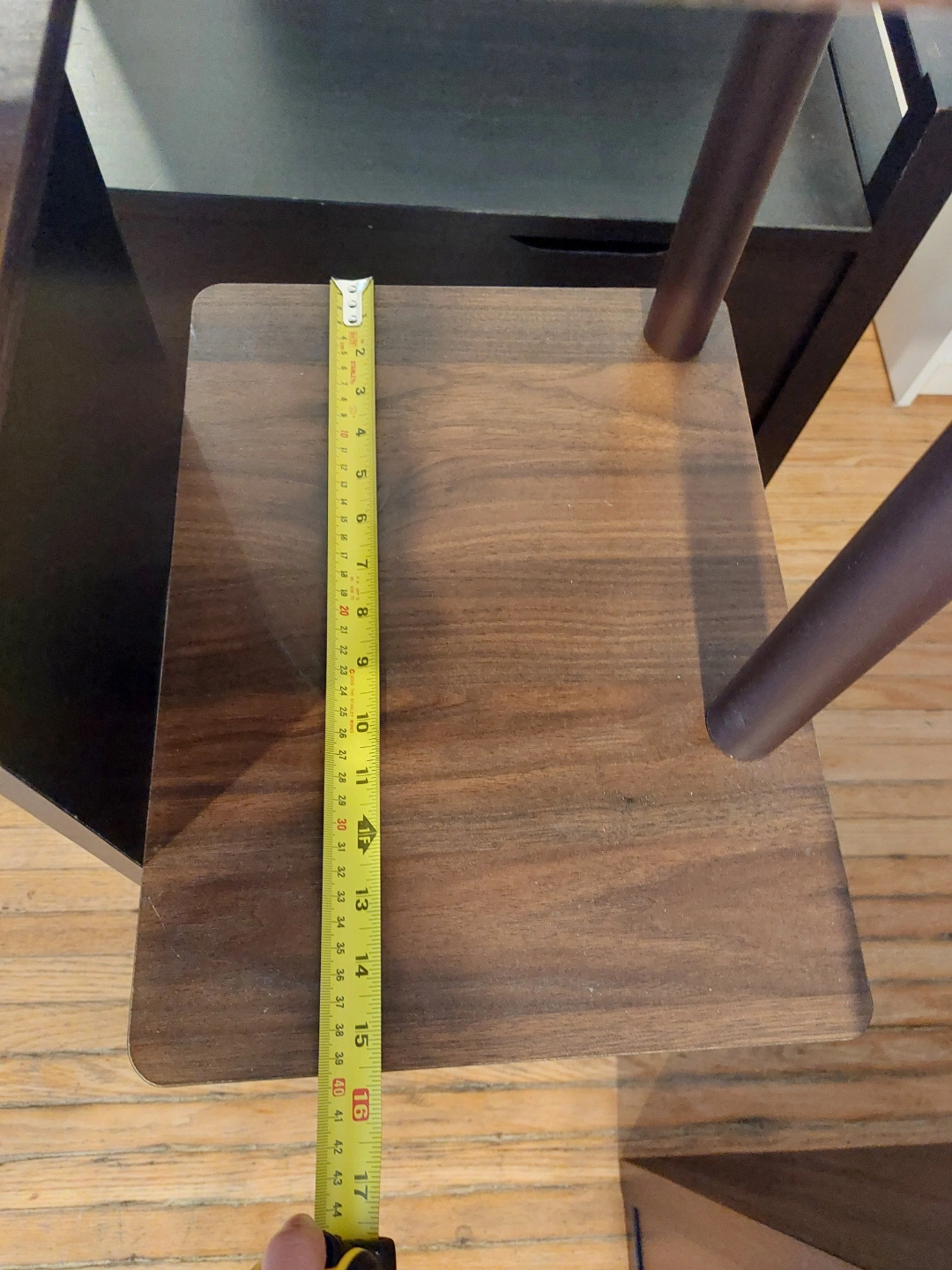 Compact, sturdy desk with dark wood grain finish. The shelves on the side offer extra storage or a space to fit your PC. Has minor wear and tear from use, but is in great shape overall. Good for small apartments and home office.