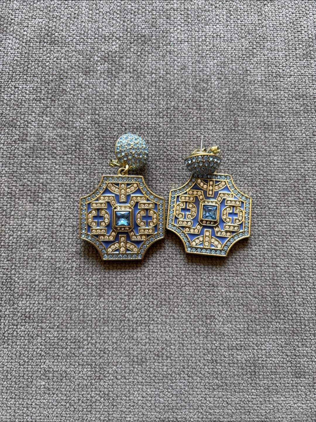 Earrings in gold-tone metal. Features a geometric shape and blue accents with crystals. Perfect to elevate your outfit.