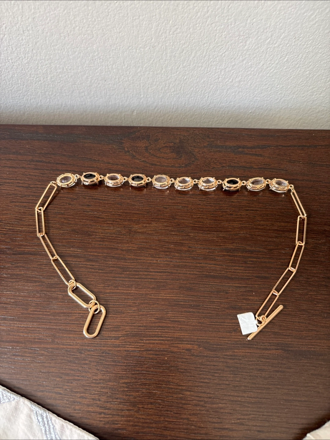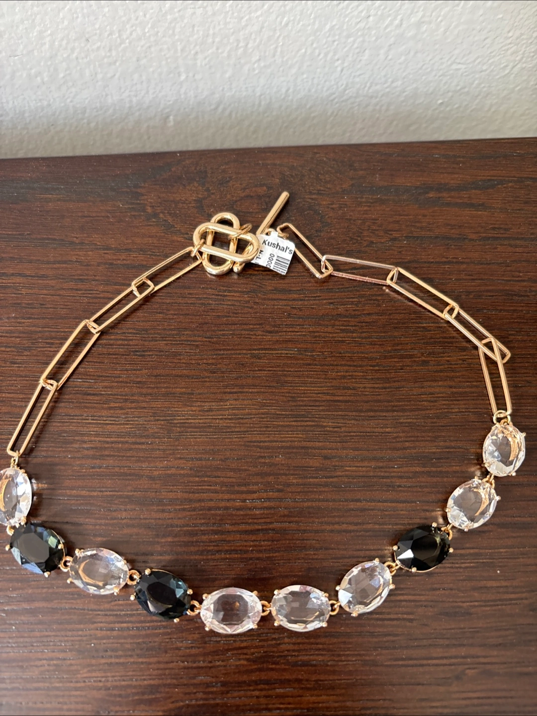 A gold-tone necklace. Features oval-shaped gemstones. The clasp is a unique design. This necklace could be the perfect touch to complete your outfit.