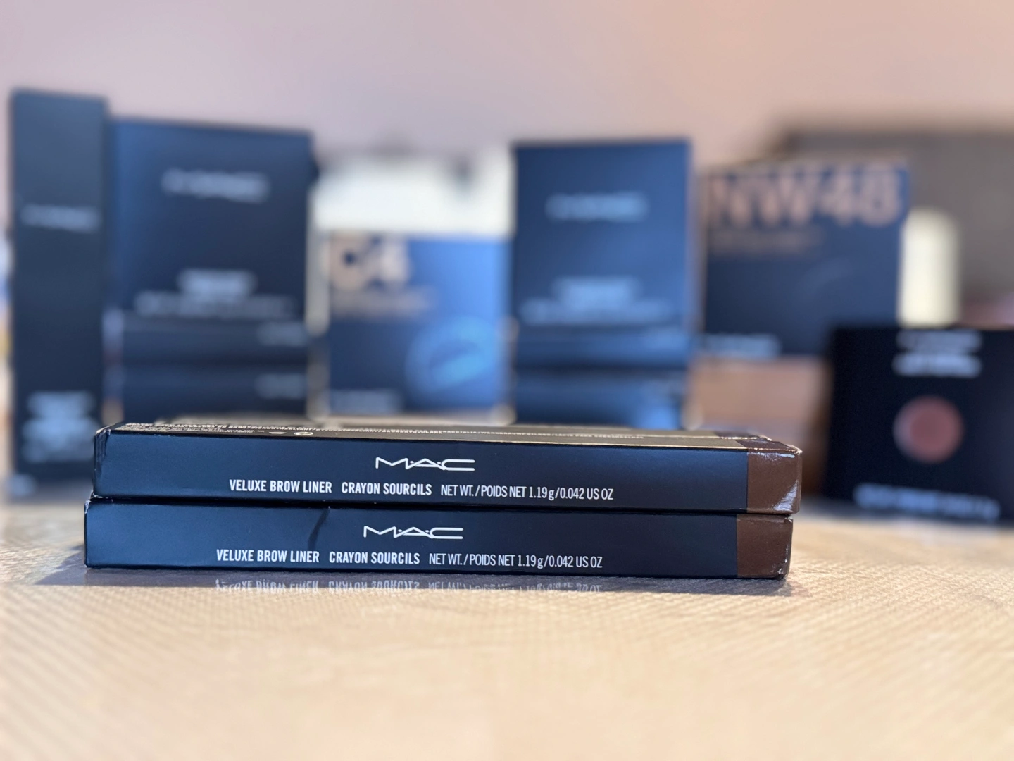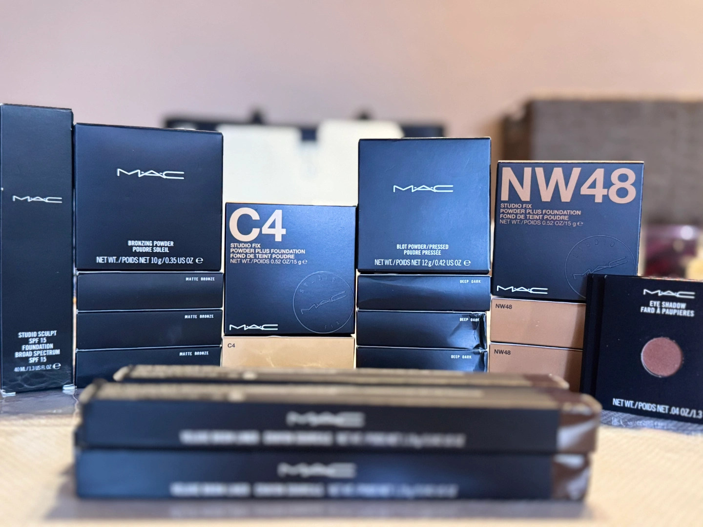 Collection of MAC makeup products. Boxes of powders, foundations, and liners. Great for adding to your everyday makeup routine.
